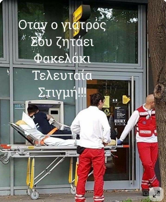 Και δεν έχει προλάβει να πάει ακόμα στον γιατρό, από τους τραυματιοφορείς του ασθενοφόρου ξεκινά το φακελλάκι.