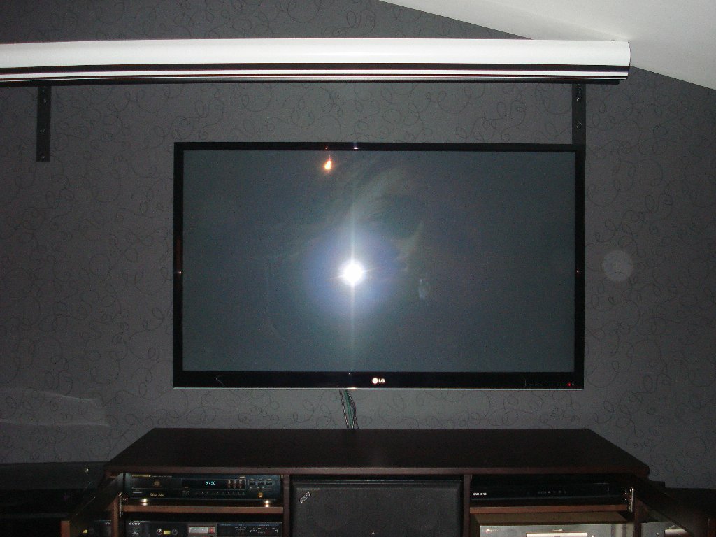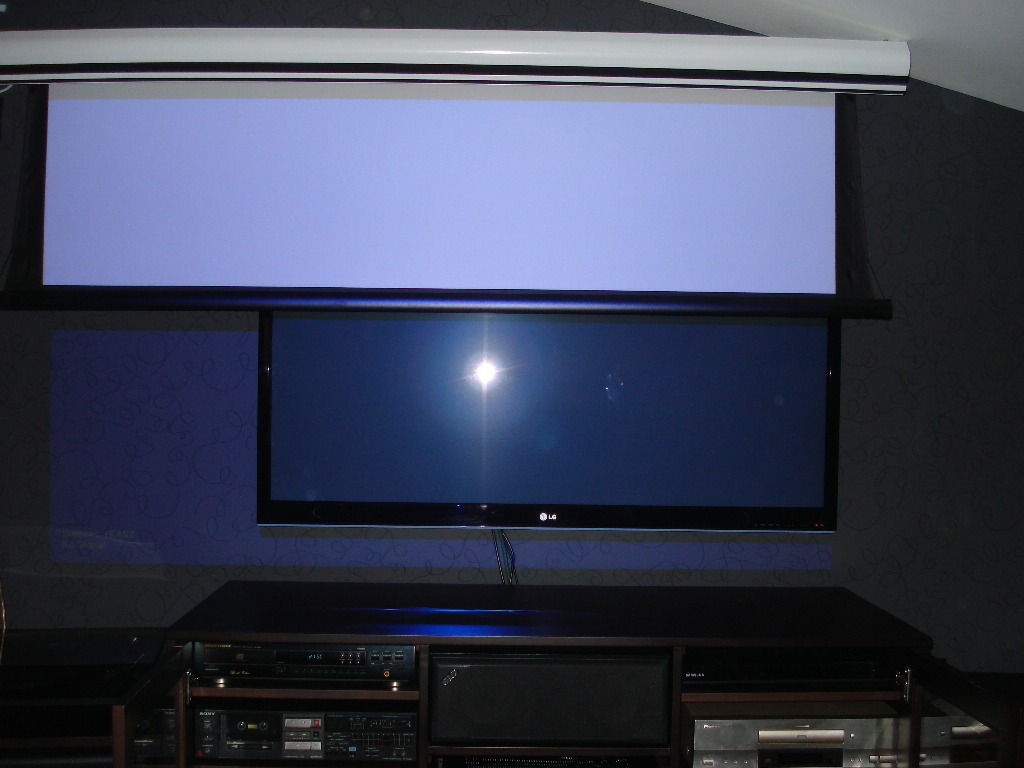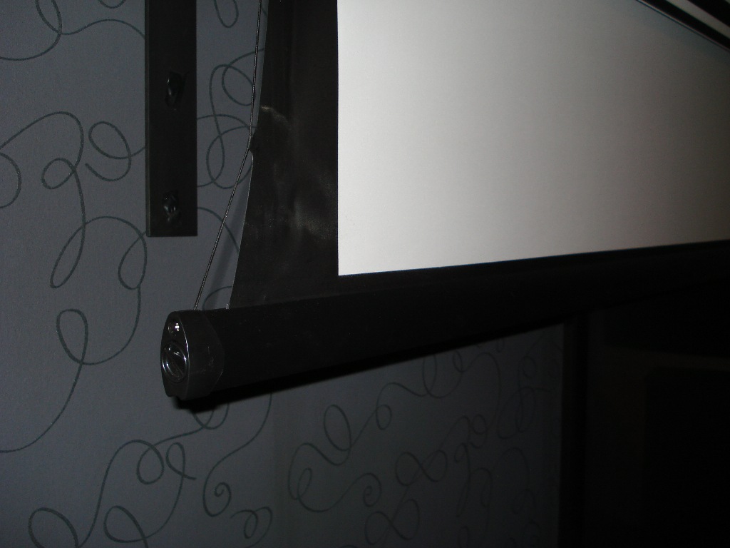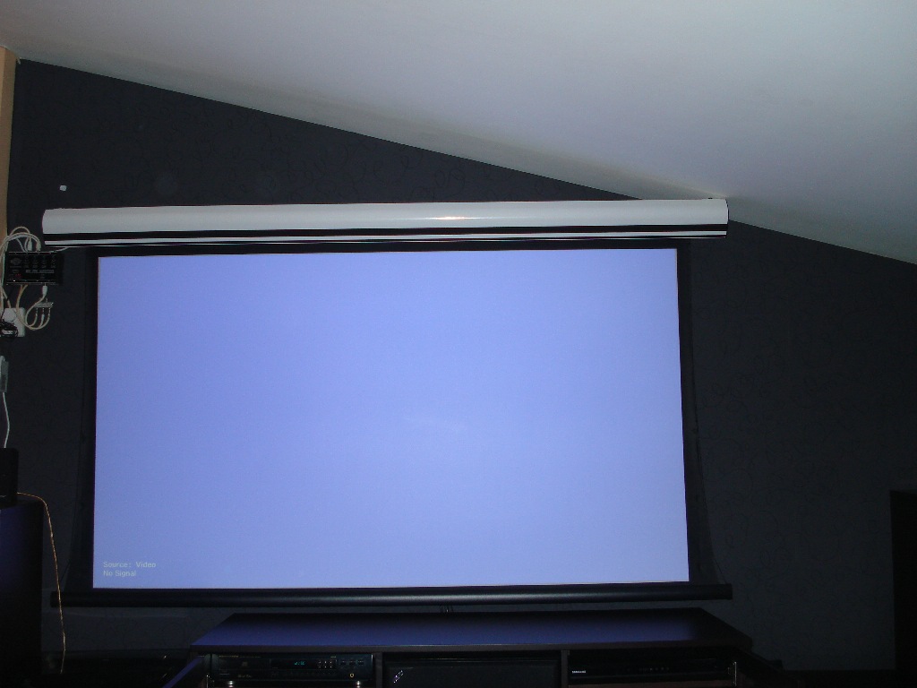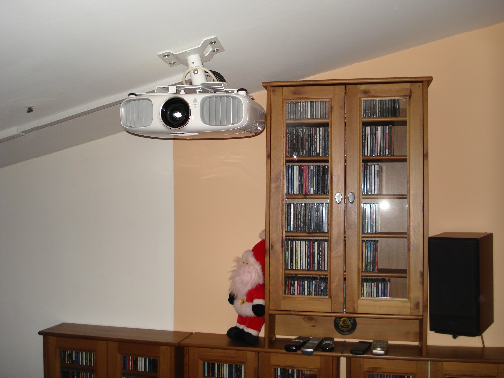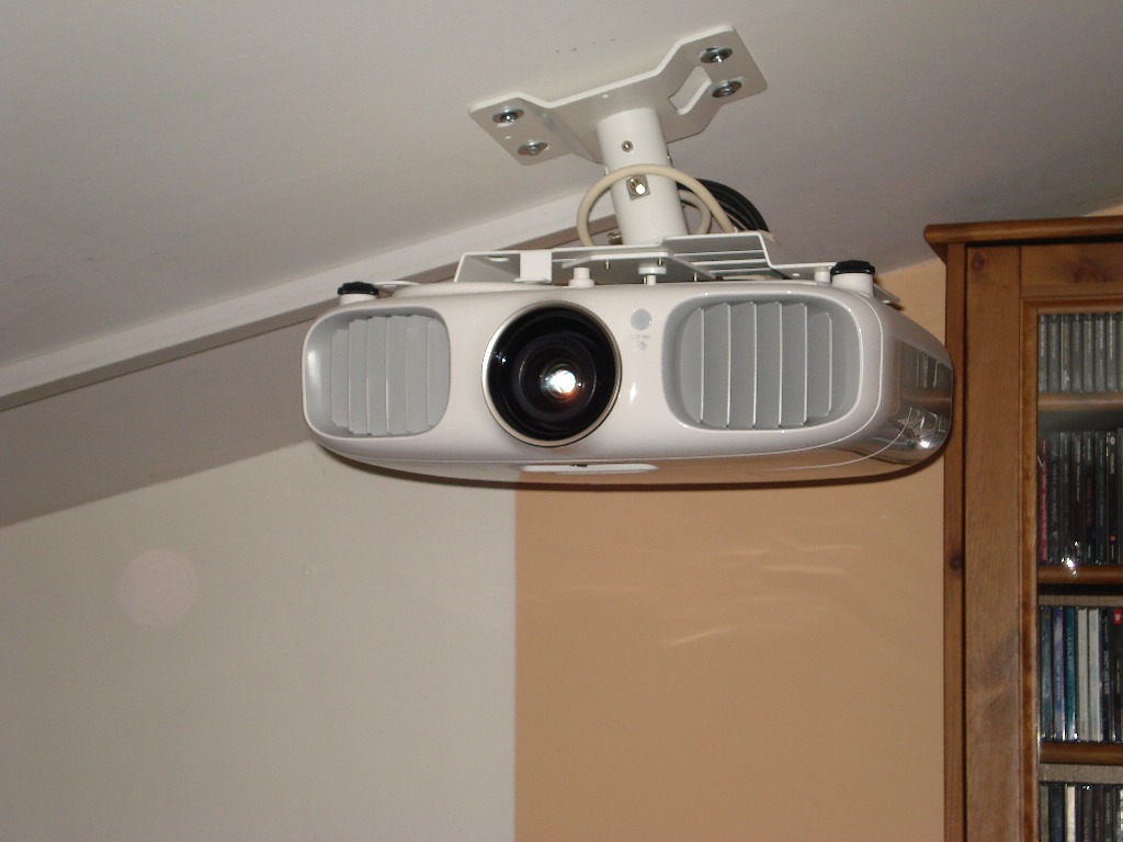Ο προβολέας είναι ο epson TW6000 σε ειδική βάση που κρατάει τον προβολέα σε οριζόντια θέση σε σχέση με την κλίση του ταβανιού.