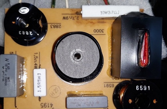 Ο υπεύθυνος είναι το κεντρικό πηνίο που φαίνεται, το οποίο υπερθερμάνθηκε από ισχύ. Έλιωσε το βερνίκι του σύρματος του, κυριολεκτικά έβρασε, και βραχυκύκλωσε και από τα 3,4 mH, που θα έπρεπε κανονικά να είναι η τιμή του, πήγε στο 0,1 mH.