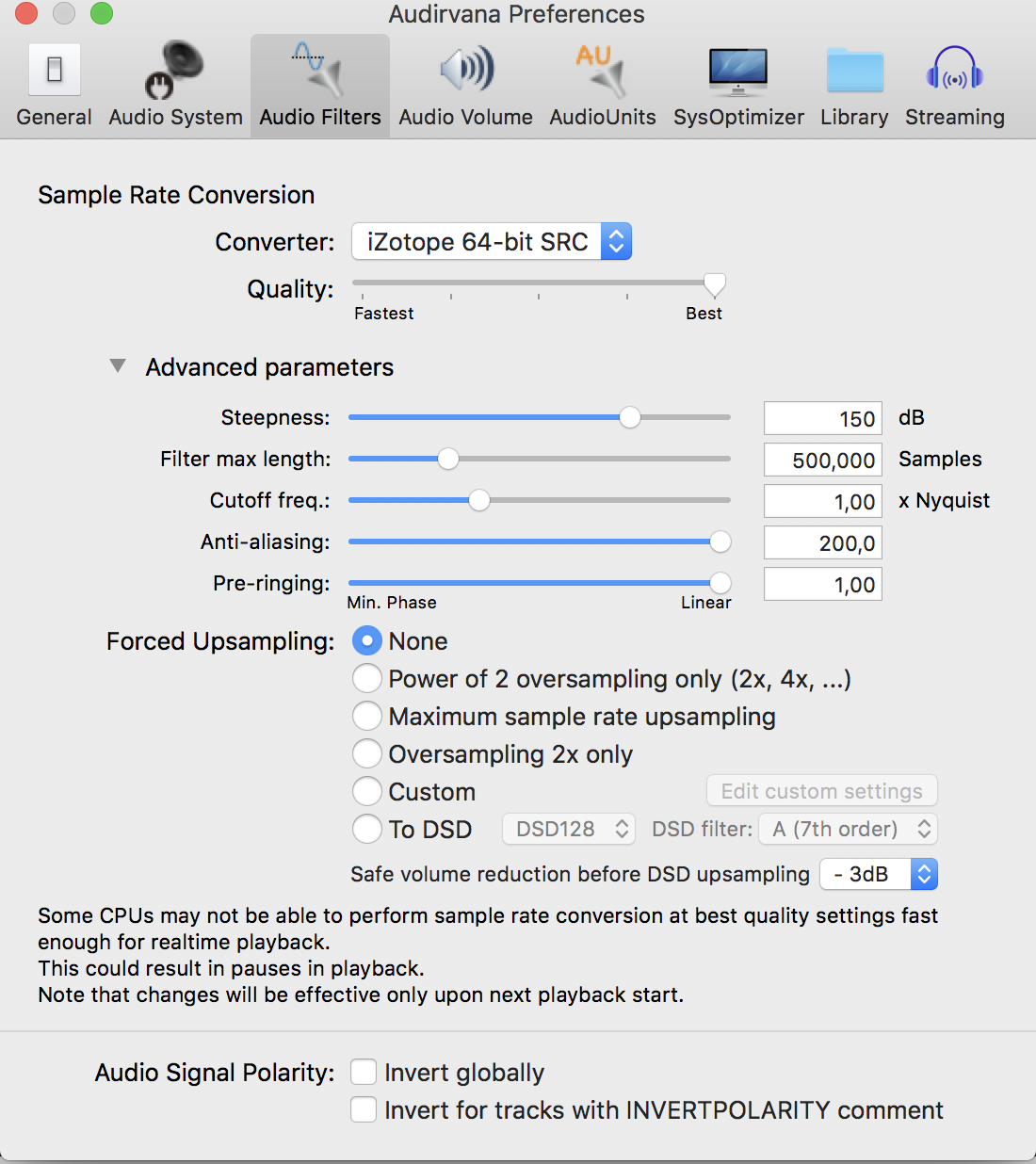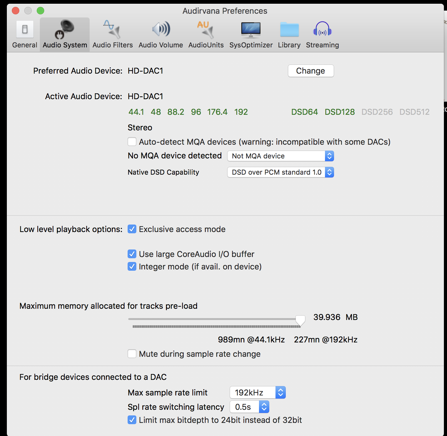 2. Παιζοντά το με το Audirvana plus 3.2.4 σε ένα imac 27" 2017, δεν αναγνωρίζει τα DSD αρχεία όταν στα preference/audio system/Native Capability επιλέξω Automatic Detection αλλά τα παίζει και η οθόνη δείχνει 176.4Κ. Αν επιλέξω DSD over PCM standard 1.0 η οθόνη δείχνει DSD 2.8 ή 5.6 αλλά μου φαίνεται πιο φτωχός ο ήχος.