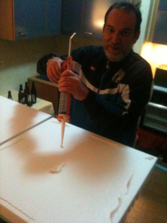 Εδω με μεγαλη δεξιοτεχνια κολλαω τα υλικα μεταξυ τους.
