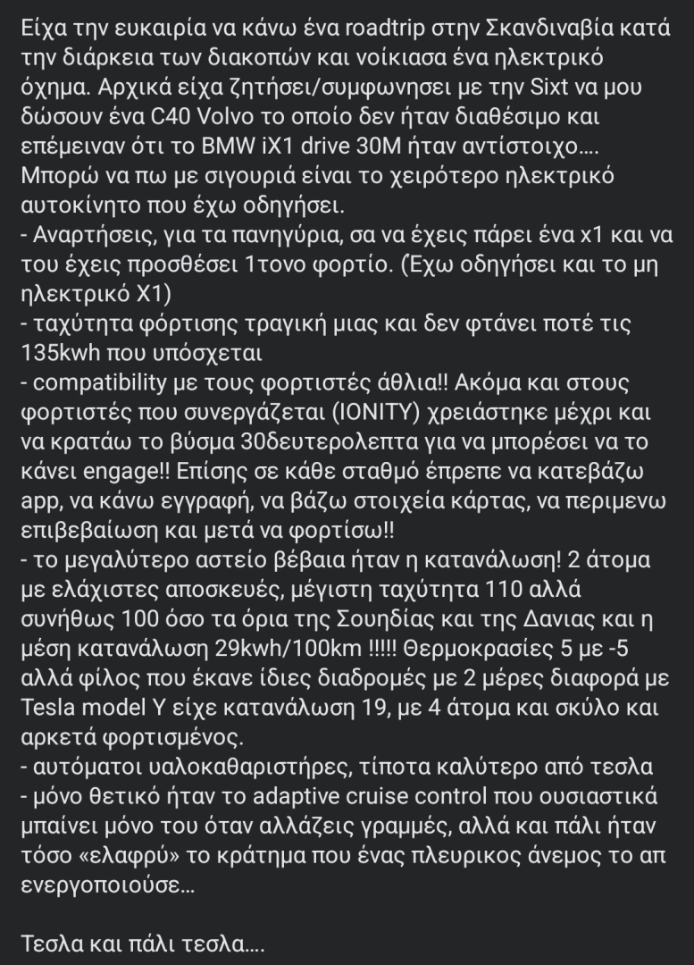 Επειδή έχω οδηγήσει το ix1 (και το Υ, το παλιό και το νέο 3) σίγουρα δεν έχει χειρότερη ανάρτηση από Tesla και ειδικά από Υ. Το εικονιζόμενο παραπάνω ιχ1 είναι και με adaptive ανάρτηση όπως το νέο model 3. Το νέο 3 είναι πιό άνετο στις ανωμαλίες δρόμου από ιχ1, χάνει όμως σε αίσθηση οδήγησης σε σχέση με το BMW. Επίσης ο φίλος μας δεν αναφέρθηκε καθόλου σε ποιότητα, τριγμούς, θόρυβο κύλισης που έχει το Υ σε σχέση με ιχ1 (το Υ με διπλά τζάμια μπρος-πίσω έχει πιο πολύ θόρυβο καμπινας από ιχ1 με μονά...). Κατα τα άλλα σε σχέση με αυτά που αναφέρονται κατανάλωση, ταχύτητα φόρτισης κλπ, Tesla είναι μπροστά.