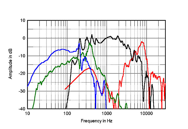 Fig.2 Auditorium 23 Hommage Cinema, acoustic crossover at 50" on midrange axis, corrected for microphone response, with nearfield responses of upper woofer (green), lower woofer (blue), and midrange horn (black), plotted in the ratios of their radiating diameters.