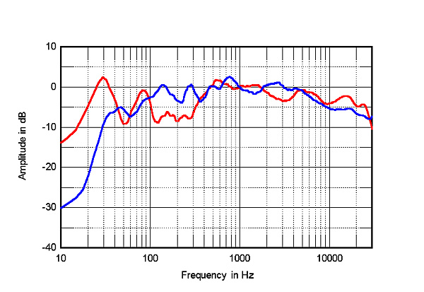 Fig.6 Auditorium 23 Hommage Cinema, spatially averaged, 1/6-octave response in AD's listening room (red); and of Wilson Duette 2 (blue).