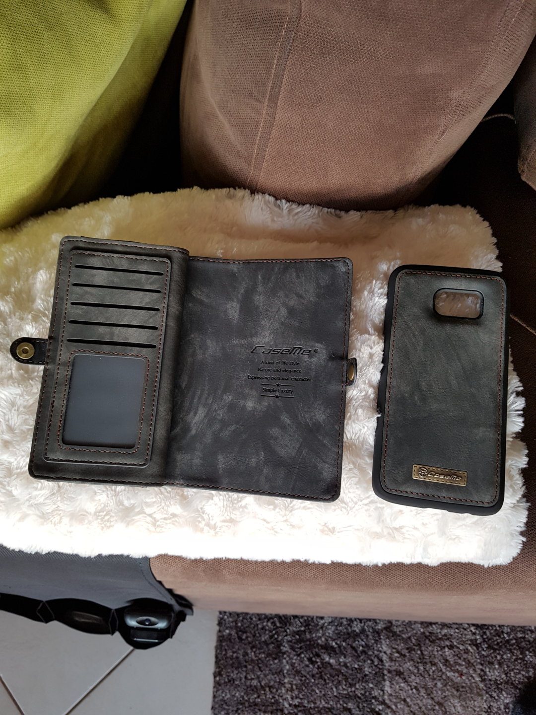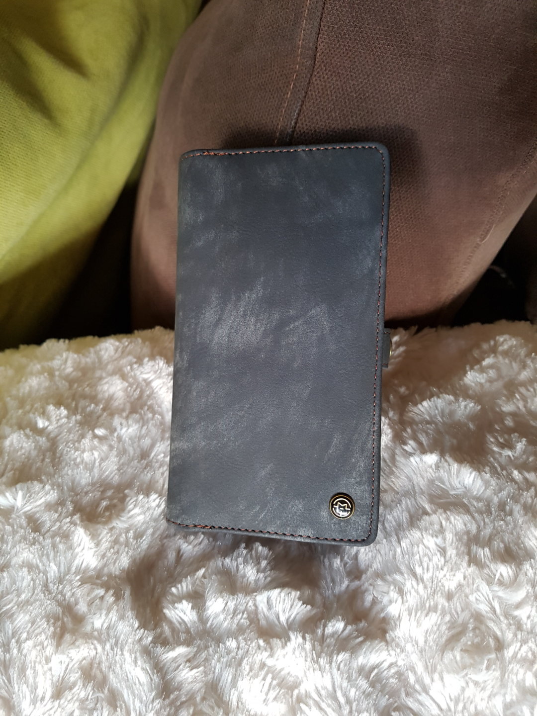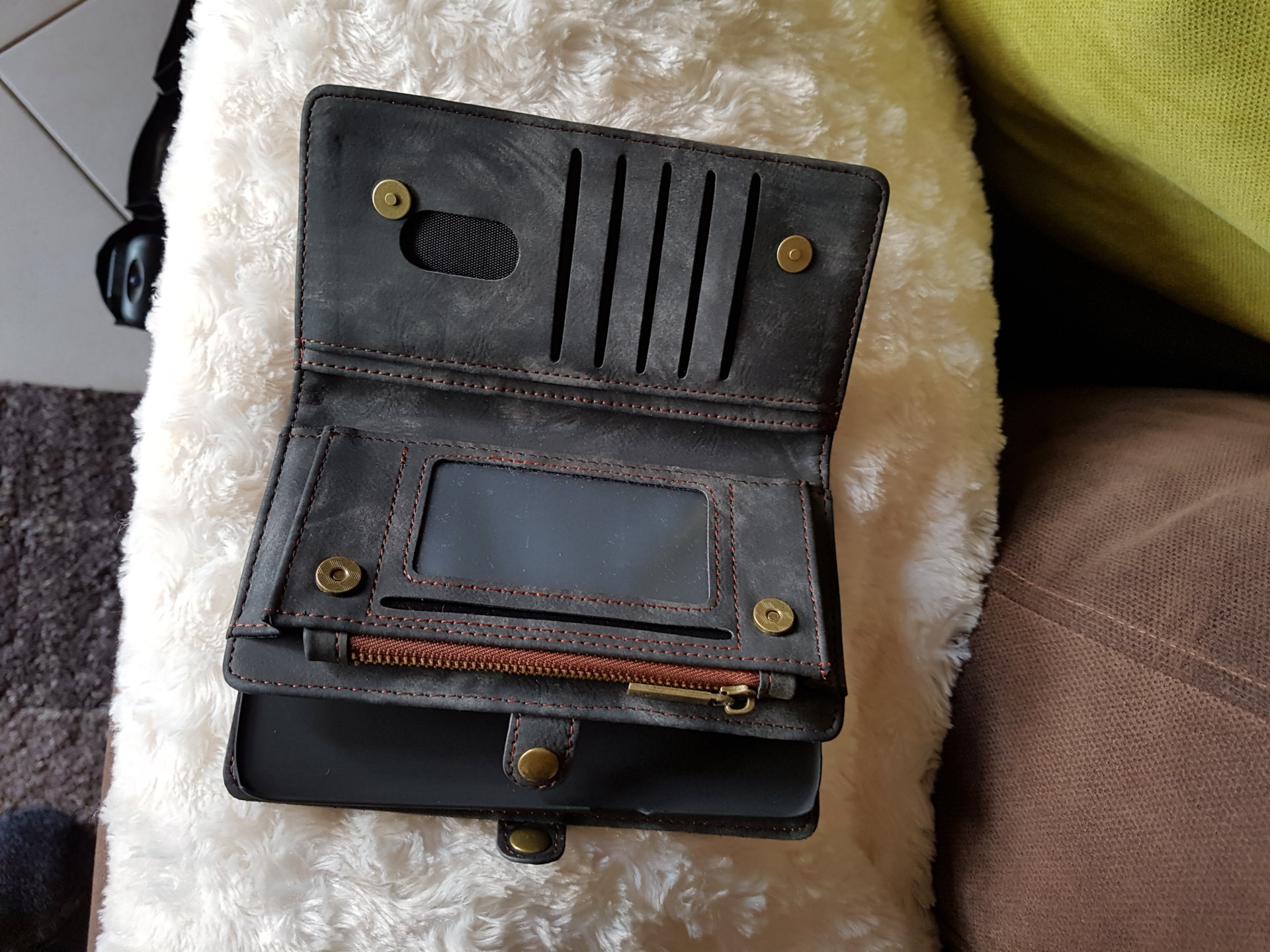 γκρι/μαύρο χρώμα . Δεν έχει χρησιμοποιηθεί, με πολλές θέσεις για κάρτες και άλλα έγγραφα, επίσης έχει μικρό φερμουάρ για κερματα. Το τηλέφωνο κουμπώνει σε δεύτερη back cover θήκη το οποίο το χρησιμοποιείτε ξεχωριστά και εφαρμοζει στην κυρίως θήκη με ισχυρό μαγνήτη.