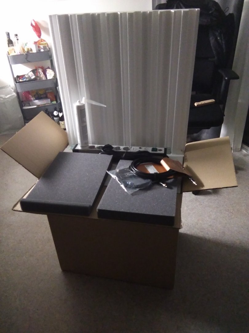 Η πρώτη φάση ακουστικής φροντίδας ολοκληρώθηκε με επιτυχία. Χρησιμοποιήθηκαν αρχικά πάνελ απορρόφησης της basotect πάχους 5εκ. με τις παρακάτω ιδιότητες στα μπροστινά τοιχώματα, εξαιτίας του γεγονότος της τοποθέτησης των ηχείων και θέσεως ακρόασης στην μικρή πλευρά θεωρήθηκε σκόπιμο να ξεκινήσω την ακουστική φροντίδα από τα τοιχώματα αυτά.
