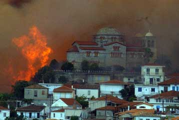 "Δραματική ημέρα η Τετάρτη, με περισσότερες από 200 πυρκαγιές να καίνε τη χώρα απ' άκρου εις άκρον. Στο χωριό Μαμουσιά του Αιγίου βρέθηκε απανθρακωμένος ένας 75χρονος. Σε Αχαΐα, Κεφαλλονιά και Καστοριά τα μεγαλύτερα μέτωπα. Κάηκαν σπίτια, άνθρωποι εγκλωβίστηκαν στις φλόγες και εννέα ελικόπτερα του στρατού επιστρατεύθηκαν για τον απεγκλωβισμό τους. Στο έλεος της φωτιάς παραδόθηκαν σπίτια στα Κουνινά Αιγίου και στην Κμπιτσάτατης Κεφαλλονιάς, όπου οι πυρκαγιές συνέχιζαν το βράδυ της Τετάρτης το καταστροφικό τους έργο. Σε γενική επιφυλακή τέθηκε η Πυροσβεστική Υπηρεσία.