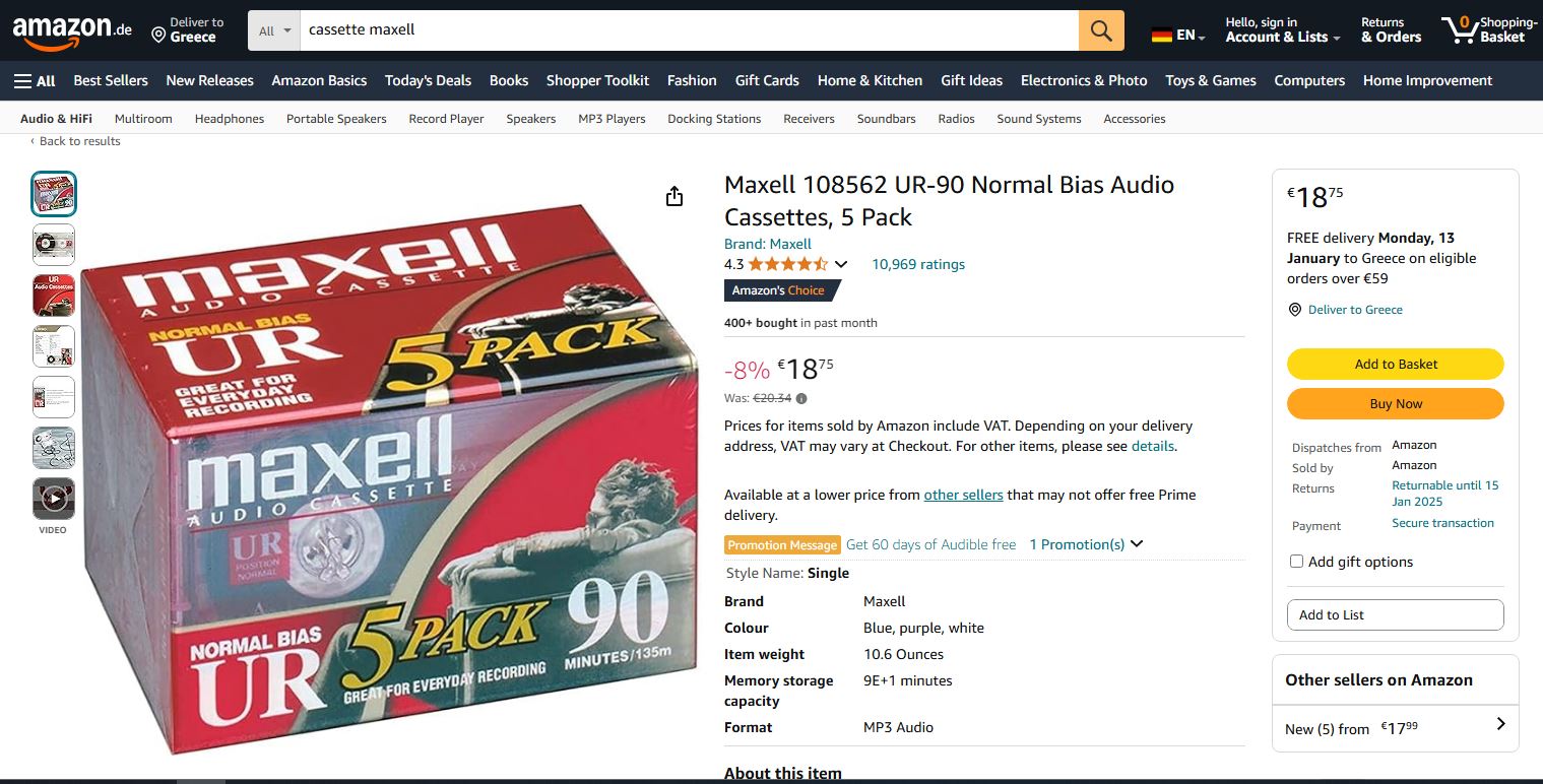 Τις συγκεκριμένες, στην Ελλάδα το μόνο κατάστημα που τις είχα βρει (σε κιβώτιο δεκάδα) ήταν ένα στην Αθήνα. Δεν θυμάμαι σε τι τιμή ήταν γιατί τις κατέβασε από το σάιτ, πάντως ήταν πανάκριβες όπως και όλες αυτές που πουλάει. Μέχρι πρότινος, είχε αμέτρητες κασέτες στο e-shop του (βέβαια πολλές από αυτές ήταν Sold Out) αλλά έκανε κάποια ενημέρωση στην ιστοσελίδα και έμειναν πολύ λίγες, αλλά και πάλι τουλάχιστον οι μισές λένε Sold Out. Οπότε ζήτημα να του έχουν μείνει καμιά 50ρια διαθέσιμες από τις 500+ που είχε, αλλά και πάλι δεν αξίζει γιατί είναι πανάκριβος. Από αυτόν είχα βρει και μια φασόν Bluesky 60 στην φριχτή τιμή των 7 ευρώ τη μία, της οποίας το Link είχα ανεβάσει εδώ.