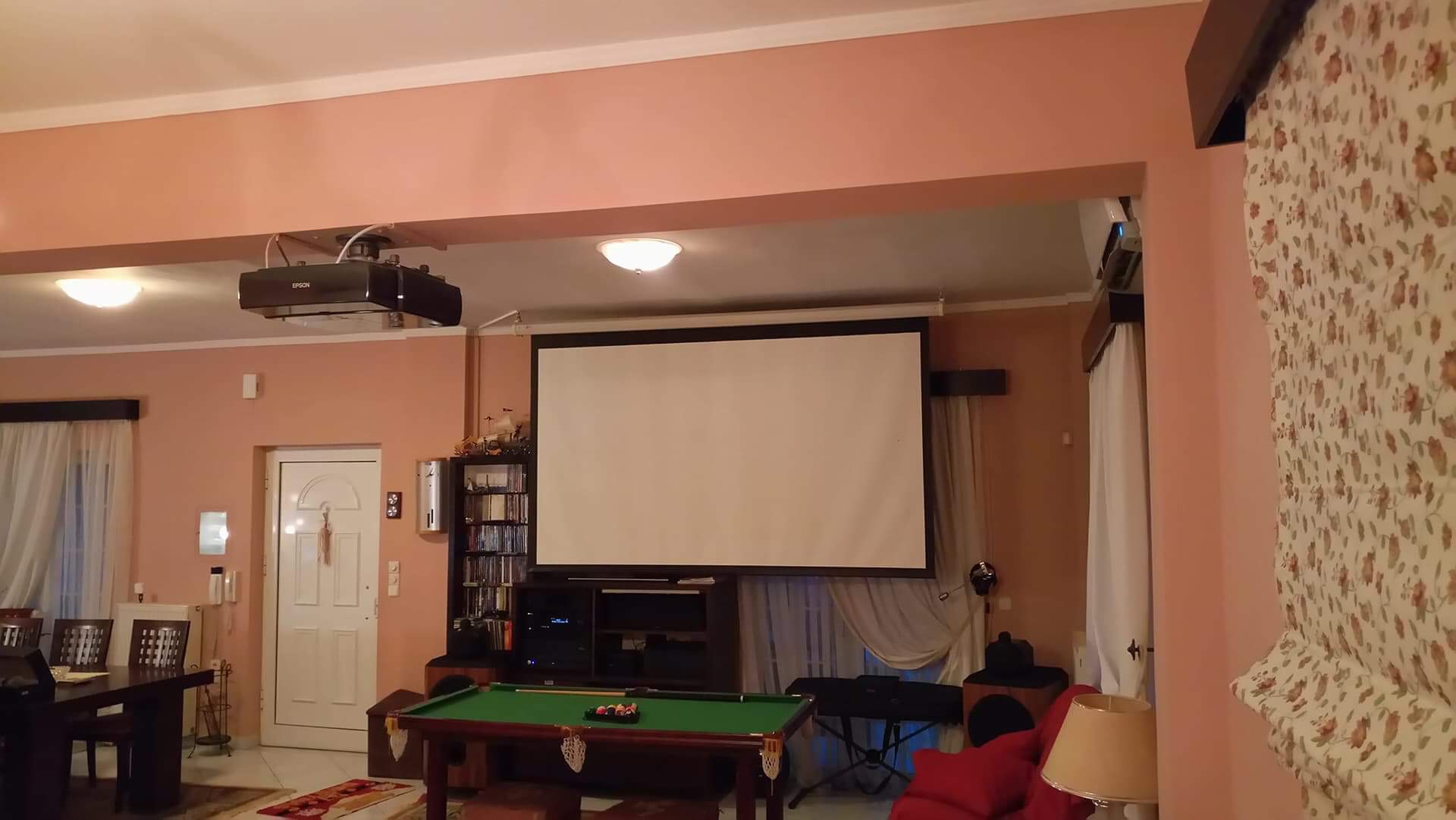 Το μπιλιάρδο μπορεί να φύγει. Είναι των παιδιών, αλλά, πλέον πιο πολύ χώρο πιάνει, παρά χρησιμοποιείται. Η διάταξη δυστυχώς δεν μπορεί να αλλάξει. Ο χώρος είναι 4 Χ 8,. Δεξιά, που δεν φαίνεται στις φωτογραφίες υπάρχει τραπεζαρία, μπουφές, κρυσταλιέρα, και άλλα...άχρηστα πράγματα, που όμως δεν μετακινούνται με τίποτα. Το μπιλιάρδο και η πολυθρόνα μπροστά στο δεξί ηχείο, όμως, μπορούν - και πρέπει - να φύγουν. Ο προβολέας είναι, όπως βλέπεις δύσκολο - για αισθητικούς λόγους - να πάει πιο πίσω από το δοκάρι στο ταβάνι