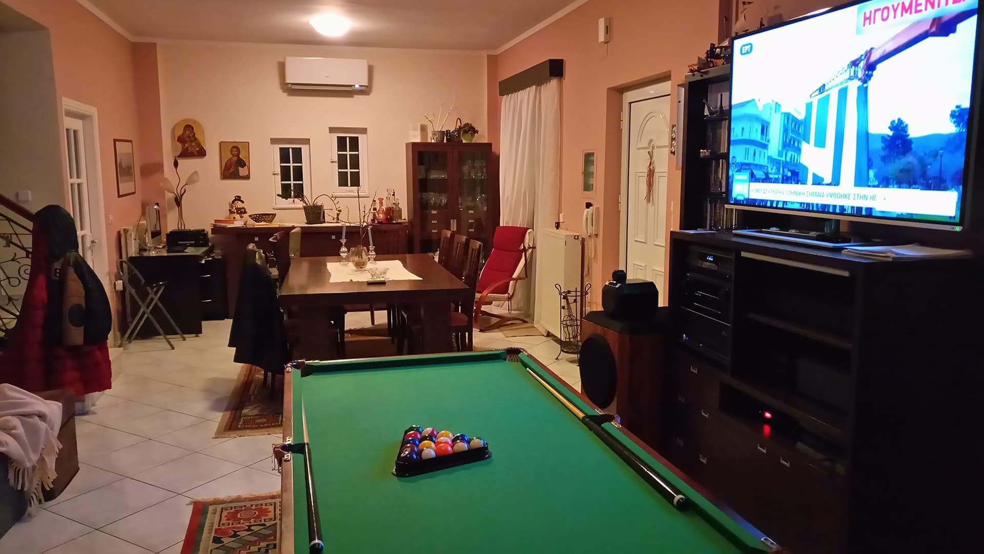 Δυο προφανείς κινήσεις ειναι να φύγει το μπιλιάρδο οπως ήδη ειπώθηκε, και αν ειναι δυνατόν να πανε ολα λίγο αριστερά, να φύγει το δεξί ηχείο απο την γωνία, και το αριστερό να παει εκεί παει ειναι τωρα το κουτί. Ετσι θα έρθουν και στην ευθεία. Τωρα ειναι μπρος-πίσω τουλάχιστον μισό μέτρο , μεγάλη αμαρτία.