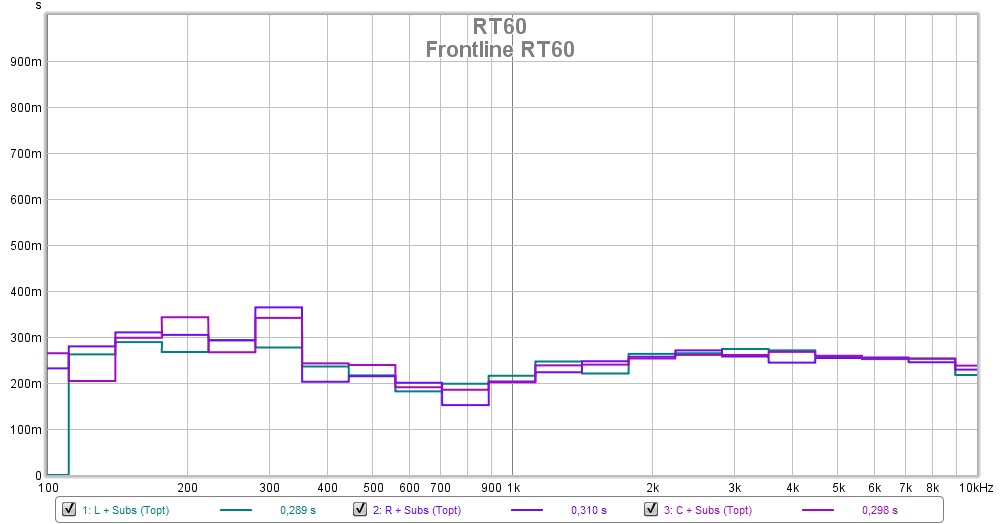 Δεν μένει παρά να λυθεί η απορία,πώς γίνεται με τόσο αποδεκτούς χρόνους αντήχησης να υφίστανται τέτοιες ανισορροπίες ανάμεσα στα επιμέρους κανάλια - οι οποίες θα φαίνονταν και ακόμα εντονότερες υπό μικρότερο βαθμό εξομάλυνσης (1/12 octave).Μήπως το πολυκαναλικό στήσιμο δεν έχει γίνει με τις δέουσες διατυπώσεις;Παρηγοριά μου μόνη οτι δε κουδουνίζει το σύμπαν, με μια ικανοποιητική ισορροπία στους χρόνους αντήχησης.