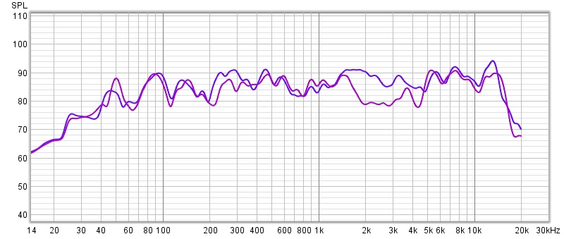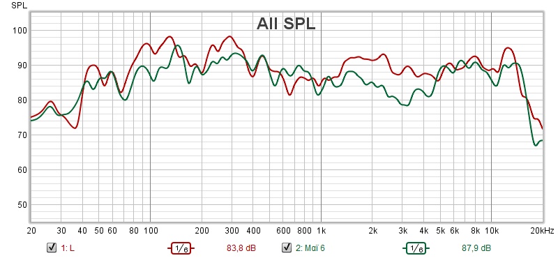 Και ως συμπληρωματική αναφορά,οι αποκρίσεις αριστερού (πράσινο) και δεξιού (κόκκινο) καναλιού σε setup χωρίς sub,στημένο σχολαστικά με το αυτί με γνώμονα τη γνωστή καμπύλη της Bruel & Kjaer και χωρίς την παραμικρή διόρθωση μέσω DSP ή φροντίδα ειδικά στις πρώτες οκτάβες,μονάχα παθητικές επεμβάσεις (απορρόφηση/διάχυση) με ωφέλιμο εύρος πάνω από τη ζώνη Schroeder.