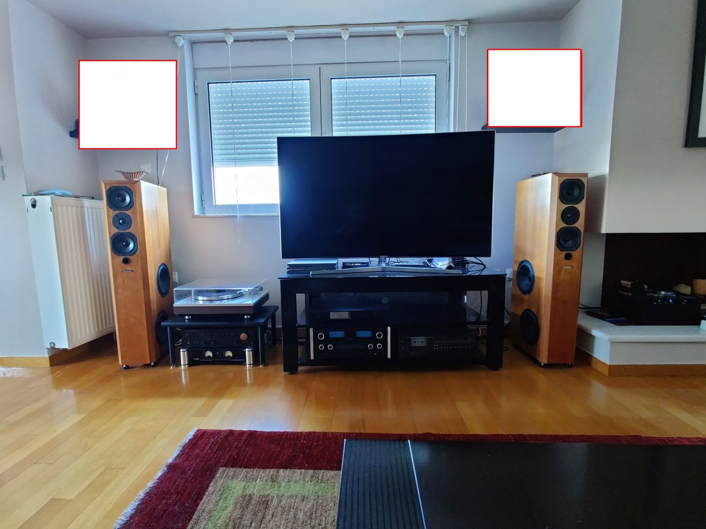Τα ηχεία μπαίνουν αντίστροφα με τα woofer προς τα έξω, οπότε τα woofer του αριστερού ηχείου απέχουν 40 πόντους από τοίχο (καλοριφέρ μάλλον) και του δεξιού ηχείου αντανακλούν στην απέναντι γωνία του τζακιού στους 160 πόντους.