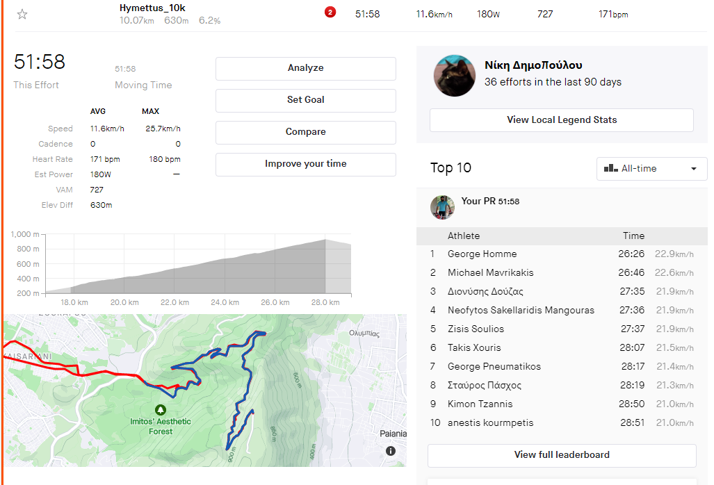 Έκανα κάποια σφάλματα στο ρυθμό, δεν ήξερα τη διαδρομή καθώς ήταν η πρώτη μου φορά, τα οποία εντόπισα και ελπίζω να μην επαναλάβω. Σα διαδρομή ο Υμηττός δεν έχει σχέση με την Πάρνηθα, είναι πολύ πιο δύσκολος κι επικίνδυνος. Τα 3-4 πρώτα χλμ έχουν πλάκα, τα 3-4 επόμενα είναι ζόρικα και τα 3 τελευταία απλά πόνος με τρελό αέρα.