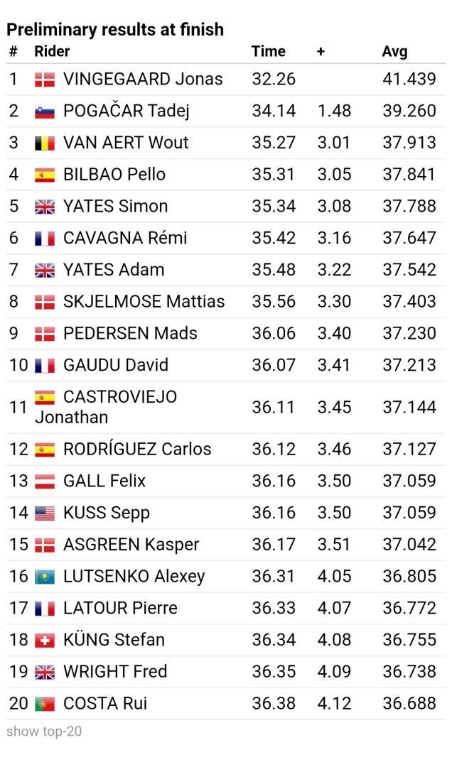 Το αποτέλεσμα ήταν εξωπραγματικό. Ο TP έκανε φανταστική επίδοση, ρίχνοντας 1' 13" στον μέχρι τότε καλύτερο χρόνο. Ο JB όμως θα μιλούσε τελευταίος. Έριξε στον Pogacar 1' 48" !!!