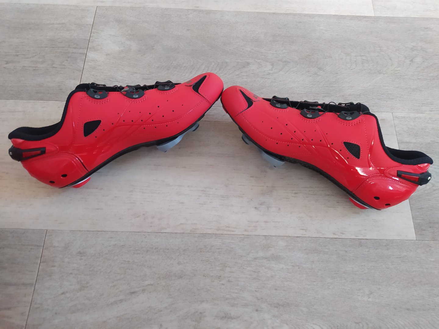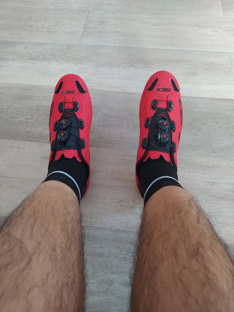 Στο τελευταίο κατάστημα που μπήκα, "έπεσα πάνω" στα εικονιζόμενα SIDI Shot, σε αυτό το κόκκινο χρώμα, νούμερο 43, τελευταίο κομμάτι - με γενναία έκπτωση. Κρέμασε το σαγόνι μου λέμε, love at first sight που λένε και στο χωριό μου. Τα δοκιμάζω, "γάντι" λέμε, λες και κατασκευάστηκαν για τα πόδια μου. Ταιριάζουν και με τα χρώματα του ποδηλάτου μου (μαύρο κόκκινο), τι να σας λέω τώρα, έρωτας λέμε, έρωτας!