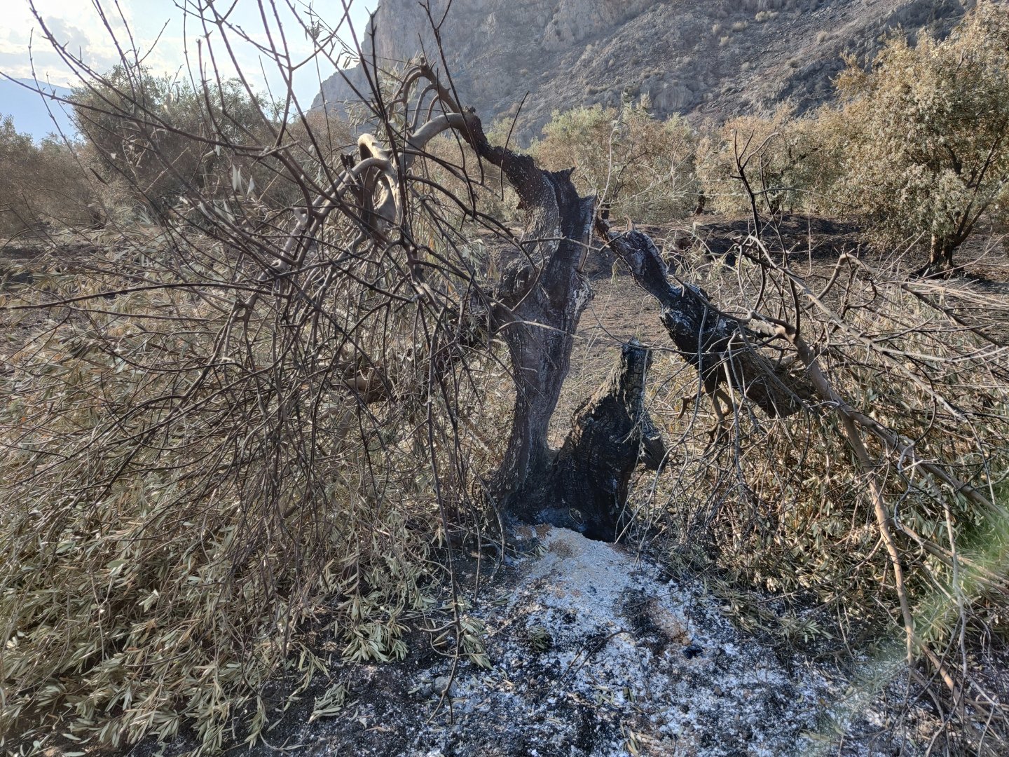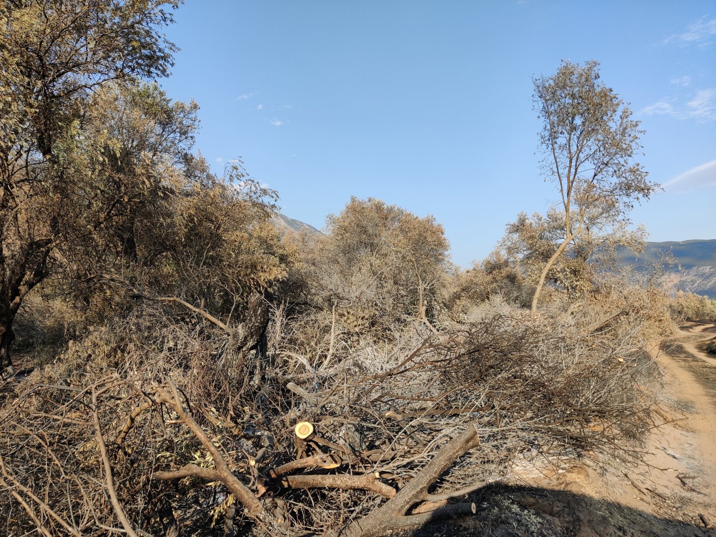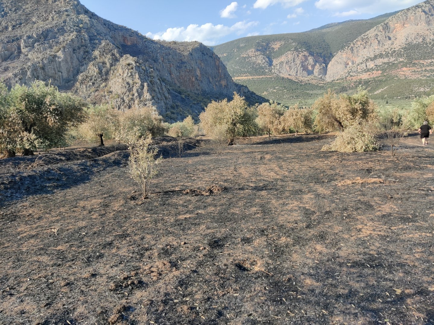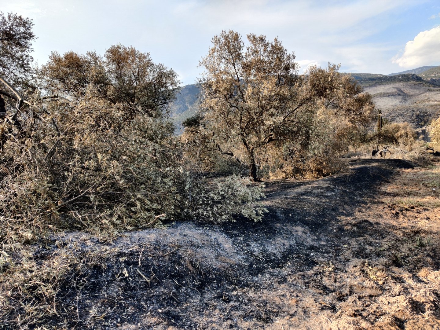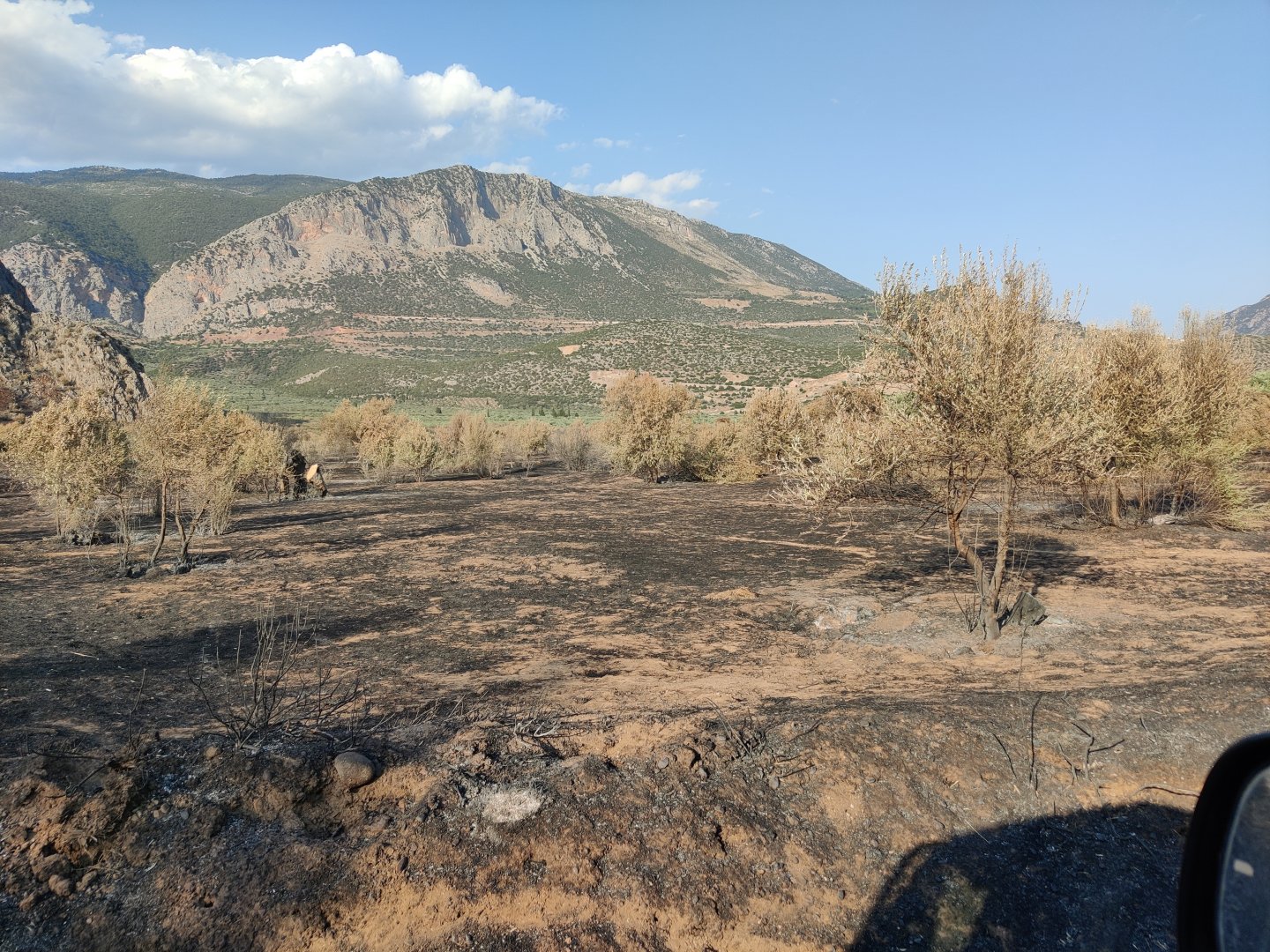 Κρανίου τόπος. Το 2013 η φωτιά είχε περάσει από το ίδιο σημείο. Σε μερικές φωτογραφίες φαίνονται τα μικρά δεντράκια που φυτεύτηκαν. Δε γλίτωσε τίποτα. Ακόμη και όσοι είχαν γεωτρήσεις την "πάτησαν" καθώς τα δέντρα τους ήταν πολύ μεγάλα και πυκνά με αποτέλεσμα να καούν από πάνω. Υπάρχουν μεγάλες εκτάσεις που δεν καλλιεργήθηκαν από τότε και πάλι η φωτιά τις κατάκαψε. Ελάχιστοι γλίτωσαν και αυτοί όχι μέσα στην καρδιά της φωτιάς. Στις άκρες οι πολύ ελάχιστοι που είχαν οργώσει πρόσφατα. Προσοχή οργώσει και όχι πέρασμα με καταστροφέα.