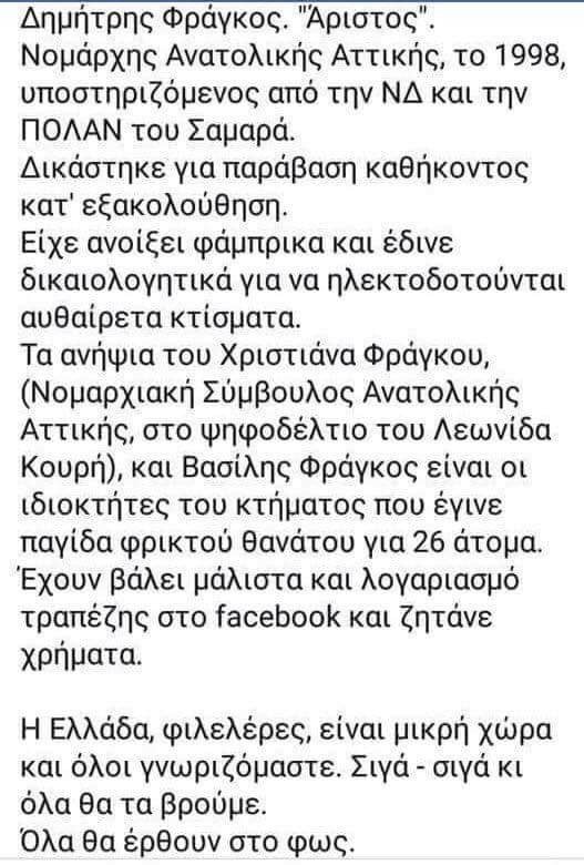 .Ηταν προφανές ότι η ελληνική πυροσβεστική τα εχασε και δεν ειχε ξαναδει κατι τέτοιο.Γι αυτό όλα τα σχεδια απέτυχαν και ολη η προγνωση που θά εφτανε η φωτιά απέτυχε.Ωστόσο μιλάμε για επαγγελματιες πυροσβέστες που επρεπε να είναι πιο ετοιμοι.Απτη μια μας ειπαν ότι ειχαν φλογες 30-40 μετρων που ηταν αδύνατον να αντιμετωπιστουν και θυελλωδεις ανέμους και απ την άλλη νόμιζαν ότι η Μαραθώνος θα σταματήσει τη φωτια.Ότι και να συζητάμε για δεντρα και αναρχη δόμηση,εδω ηταν συγκεκριμένη υστέρηση της πυροσβεστικής,που ειχε μιαμιση ωρα να στειλει κόσμο μέσα στο Μάτι να αδειάσει την περιοχή και δεν εκανε τίποτα.