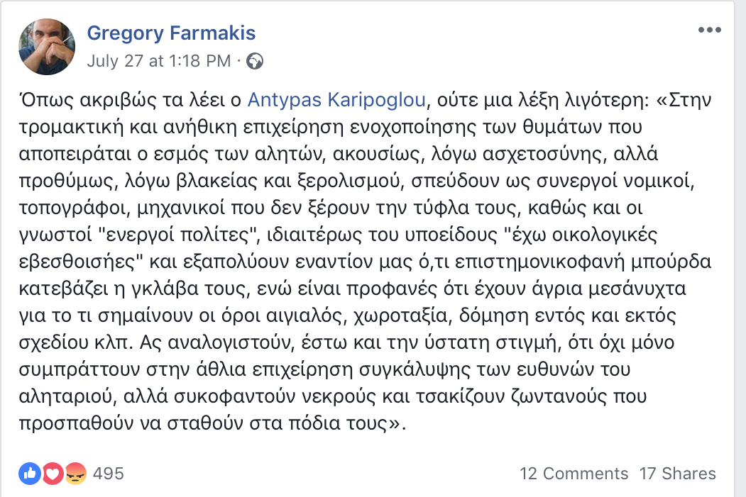 Υ.Γ. Το τί γράφει κάποιος που έχει περιουσία στη περιοχή, λίγο με απασχολεί. Περιμένω τα πορίσματα.