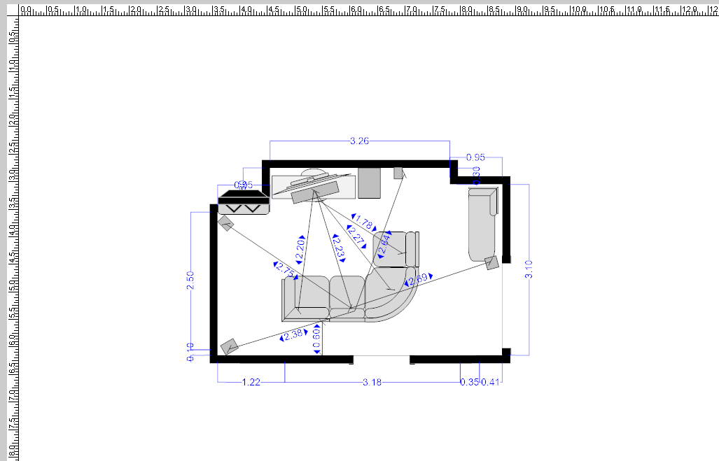 Ειμαι σε αποσταση απο μπροστινα 3,2μ το κεντρικο 3μ, τα πισω 2,8μ, και εχω σε υψος 2,4 και ιδια ευθεια με τη θεση ακροασης και αποσταση 1,5μ αλλα δυο ηχεια που εχω δηλωσει για top middle στον ενισχυτη.