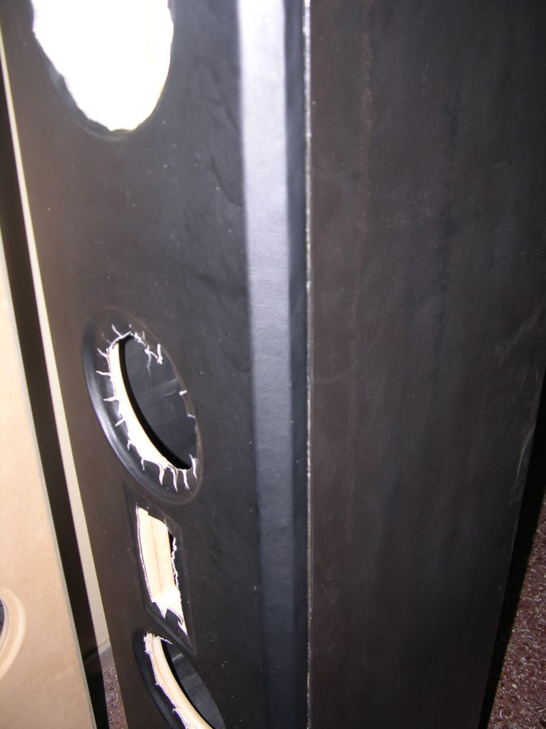 Tελικά έβγαλα άκρη με τις βίδες και είμαι κομπλέ,ας όψεται το hangover της Κυριακής που δεν έκανα απολύτως τίποτα όσον αφορά την ολοκλήρωση των ηχείων.Τσίμπισα και 2 Mundorf M-cap για τα τουίτερ και το απόγευμα μάλλον τελειώνω τα πάντα.Όσον αφορά τη δερματίνη,υπάρχει σε καταστήματα με υφάσματα επιπλώσεων σε διάφορα χρώματα και ποιότητες.Προσωπικά επέλεξα αρκετά λεπτή δερματίνη με μικρή "ζάρα" ώστε να είναι ευκολοδούλευτη σε καμπές και γωνίες.Κόλλα λευκή κρυσταλιζέ στη μπάφλα,τέντωμα και εναπόθεση της δερματίνης και μετά άσκηση πίεσης.Την άφησα για λίγο να κολλήσει και στις 2 μπάφλες και μετά τοποθέτησα το ένα ηχείο πάνω στο άλλο φάτσα με φάτσα.