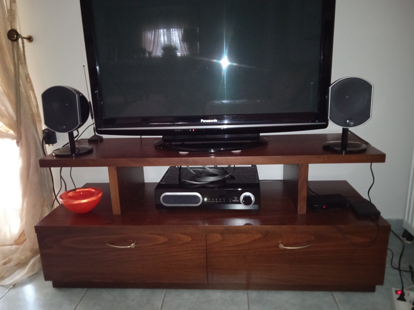 Αυτό για το οποίο δεν είμαι απόλυτα σίγουρος είναι η τοποθέτηση των ηχείων, τα οποία απέχουν περίπου 1,10 μ. μεταξύ τους, ενώ οι βάσεις τους απέχουν 55 εκ. από το πάτωμα. Να σημειώσω ότι ο ενισχυτής-σαμπ μπορεί να τοποθετηθεί είτε στην κλασική, οριζόντια θέση είτε όρθιος (όπως δείχνουν και τα σχετικά ποδαράκια).