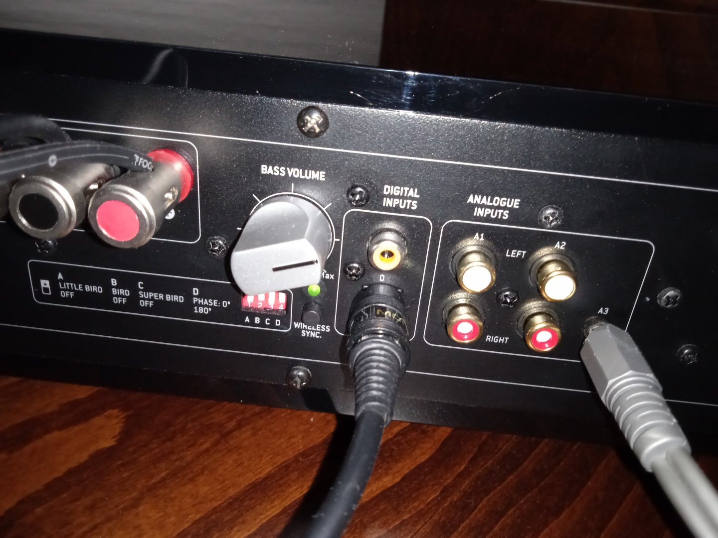 Το ''ζουμί'' όμως βρίσκεται στην κεντρική μονάδα, η οποία, πίσω από την μαύρη λάκα, κρύβει έναν διπλό χαρακτήρα: Είναι αφ' ενός ολοκληρωμένος ενισχυτής και αφ ετέρου ενσωματώνει ένα σαμπγούφερ 6,5 ιντσών. Εντύπωση προκαλεί το περιμετρικά φωτιζόμενο ποτενσιόμετρο, καθώς και το φωτάκι που μας δείχνει ποια είσοδο έχουμε επιλέξει (κάπως ενοχλητικό θα έλεγα στο σκοτάδι..). Όπως παρατηρείτε και στις εικόνες, ο ενισχυτής έχει τρεις αναλογικές εισόδους (η μία είναι jack) και δύο ψηφιακές, οπτική-ομοαξονική. Οι χαμηλες στο σαμπ ρυθμίζονται από το εδικό ποτενσιόμετρο με το ασημί χρώμα, ενώ υπάρχει και ειδικός διακόπτης που ρυθμίζει το ''κρος'', ανάλογα δηλαδή με ποιά bird το χρησιμοποιείς (μικρά, μεγάλα ή μεσαία όπως τα δικά μου).