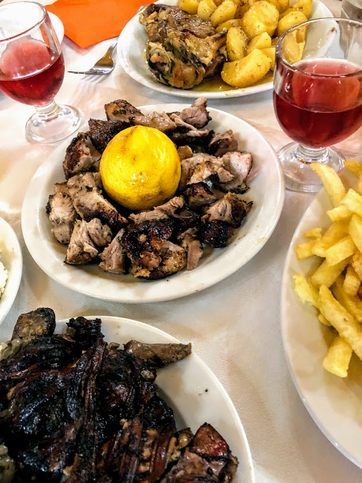 Μεσημεριανό Κυριακής. Αρνάκι γάστρας με πατάτες, κοντοσούβλι, κοκορέτσι, πατατούλες. Τα υπόλοιπα δεν φαίνονται.