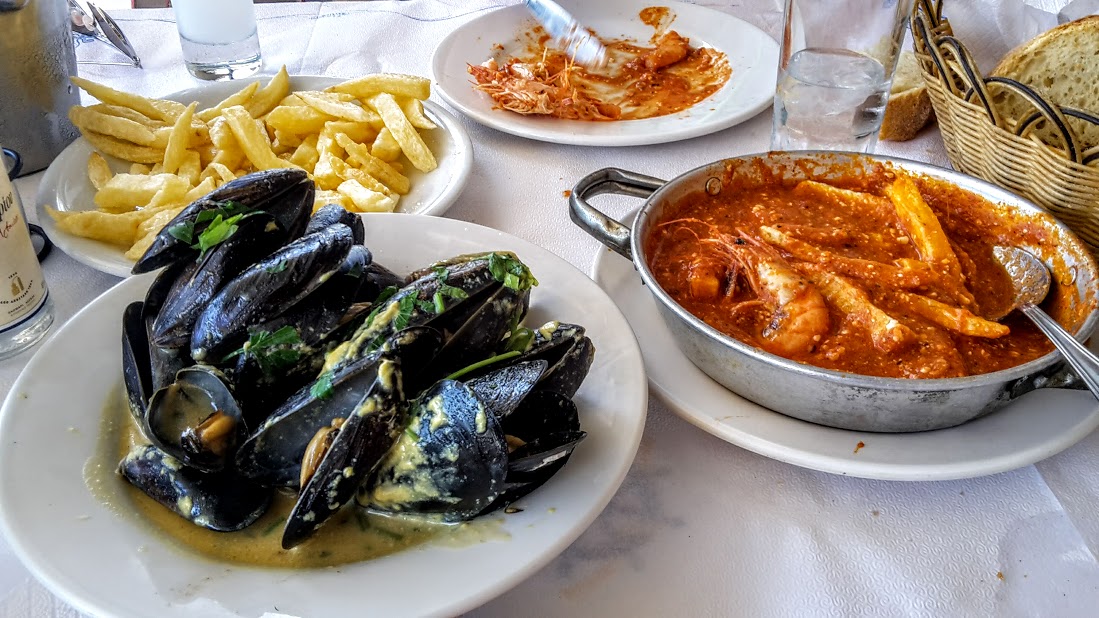 Μια απλή ντοματοσαλάτα, μια φέτα κεφαλοτύρι σαγανάκι και μια τηγανιά καυτερές πιπεριές σε λαδόξυδο.