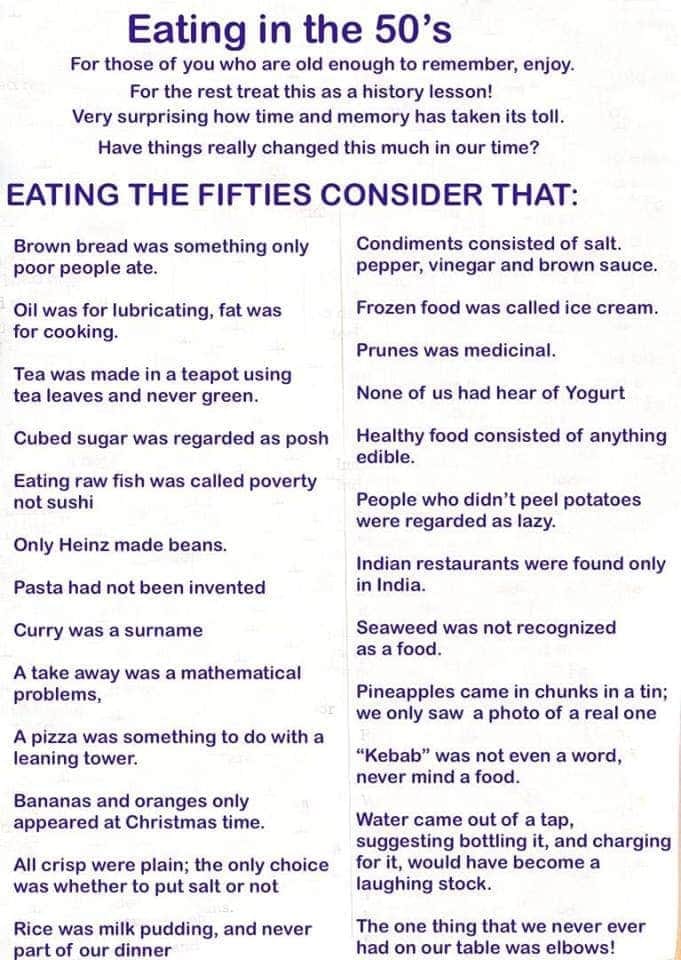 Το βούτυρο δεν το θεωρούσαν αμαρτία.Τρωνε ακόμα άσπρο ψωμί,μαρμελαδα και αλλαντικά.Πινουν το κρασάκι τους η τη μπυρα τους.Τρεφονται και με καταψυγμενα λαχανικα και ψάρι.