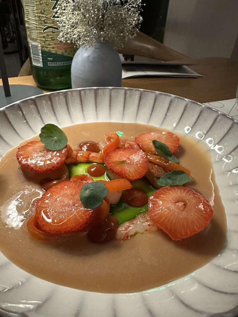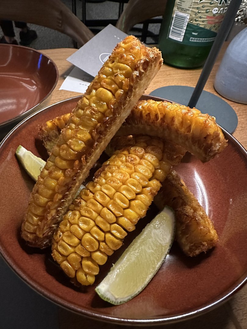 Ελαφριά:Καλαμπόκι τηγανητό με τσίλι και λάιμ, λαβράκι ταρτάρ με σορμπέ λεμόνι, και γαρίδες με φράουλες