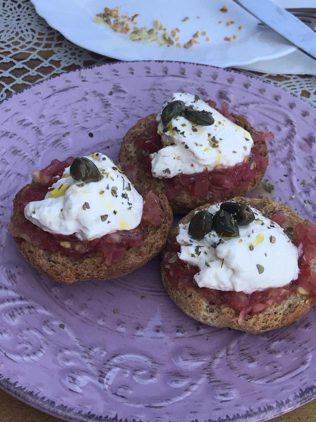 Στο τραπέζι υπήρχε πιατάκι με πάρα πολύ φέτα, προβεια αλλά και καρσικισια βουτηγμένες στο λάδι και στη ρίγανη.