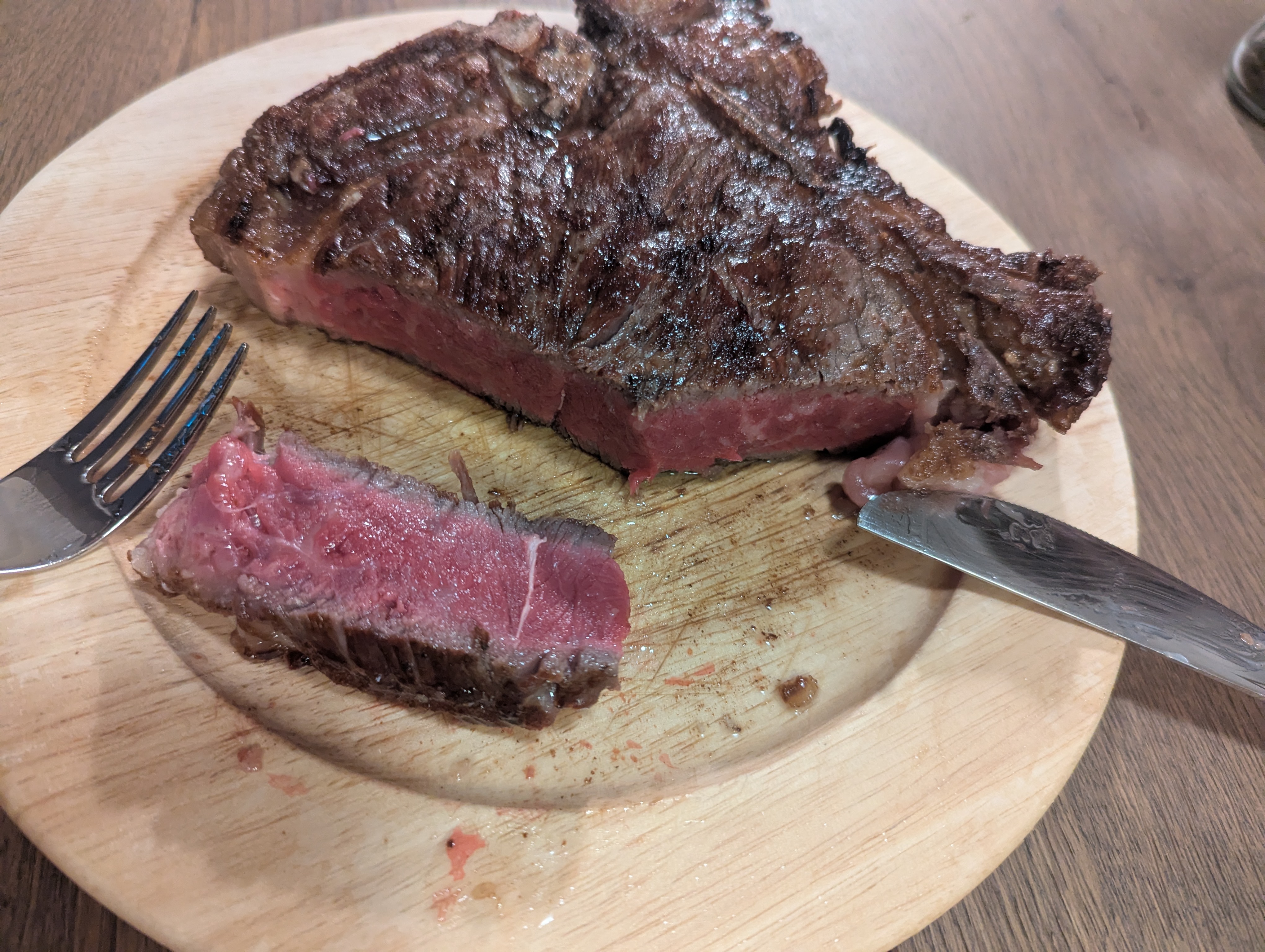 Τα κομμάτια που πήρα ήταν από μοσχάρι ελληνικό με ότι αυτό συνεπάγεται..(φτηνό μεν.... χωρίς πολύ marbling δε)! Ίσως κ για αυτό το λόγο το Chuck ήταν αρκετά πιο νόστιμο κ ζουμερο σε σχέση με την στεγνότερη Τbone.. Η αλήθεια είναι ότι έκλεψα λίγο γιατί το Chuck ήταν δύο εκατοστά πιο χοντρό.. Την επόμενη φορά θα κάνω πιο σωστά το τεστ. Ναι η porter με το περισσότερο φιλέτο θέλει πολύ προσεκτικό ψήσιμο ειδικά εάν δεν είναι sousvide... Εσένα βλέπω ότι στη πλευρά της κόντρας έχει λιπάκι και είναι χοντρό κομμάτι..άρα θα πήγε καλά...