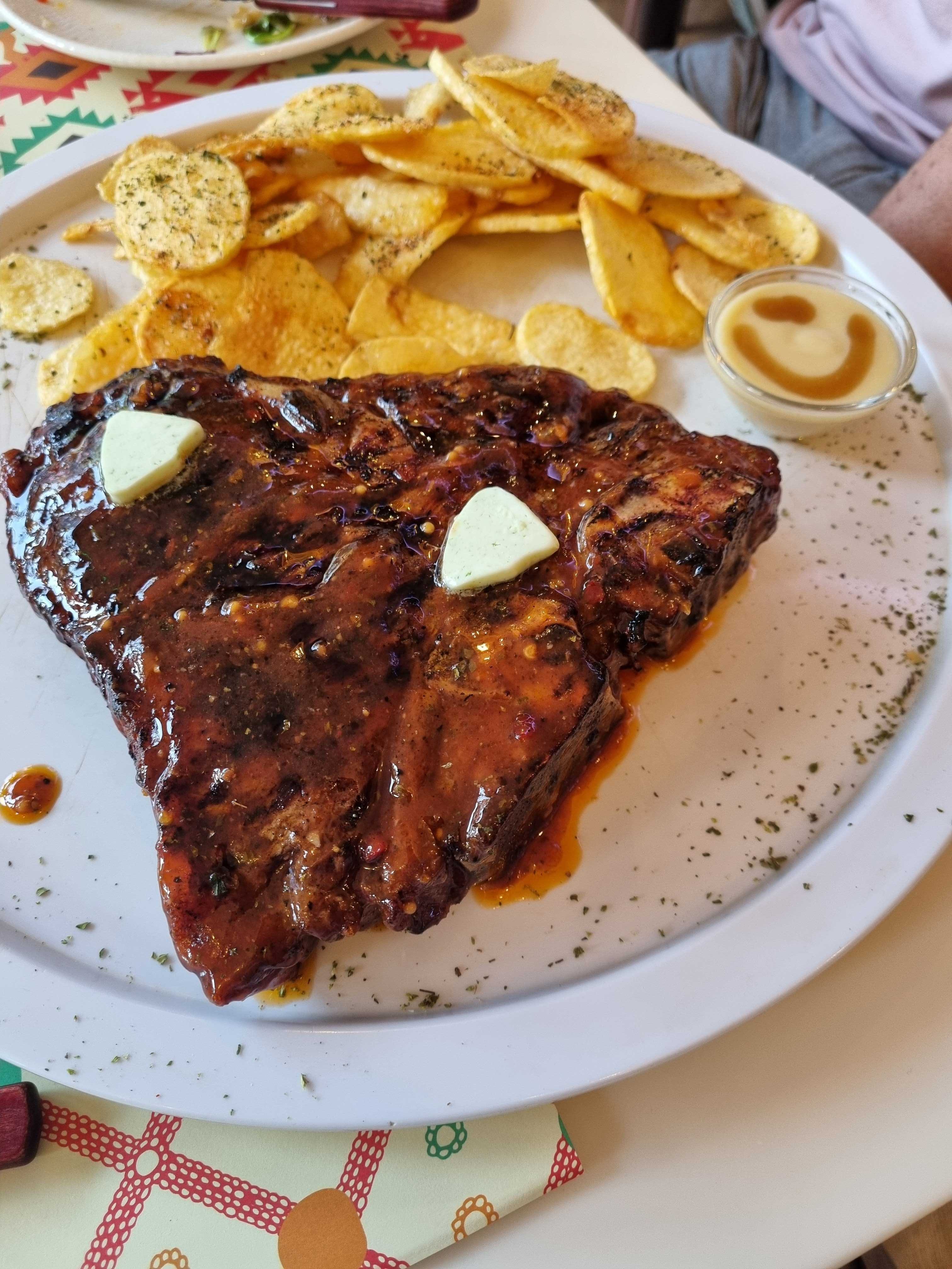 Κι οι δύο σε medium rare ψήσιμο, δεν έμεινε ίχνος κρέατος πάνω τους - αν μπορούσαμε να γλείψουμε τα κόκκαλα, θα το κάναμε!