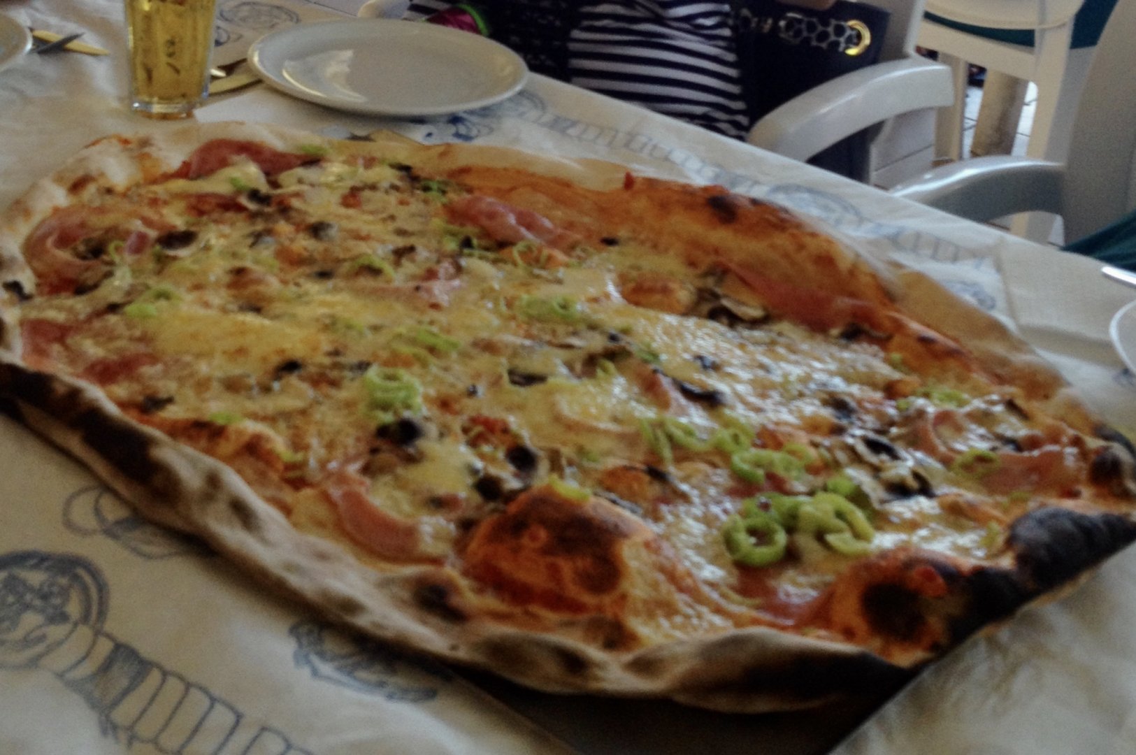 Τεράστιες πίτσες και μακαρονάδες, νόστιμες, με πολύ ωραία θέα, ειδικά το βράδυ, αλλά δεν είναι "επαγγελματίας" θα μπορούσε να το δουλέψει πολύ καλύτερα το μαγαζί του.