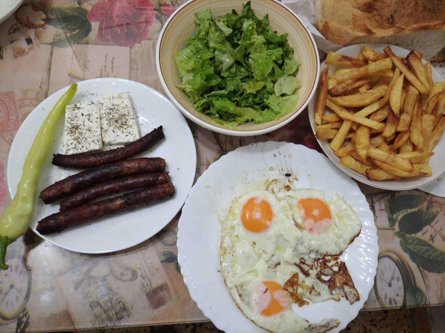 Πατάτες, αυγά, λουκάνικα, σαλάτα και μια καυτερή.
