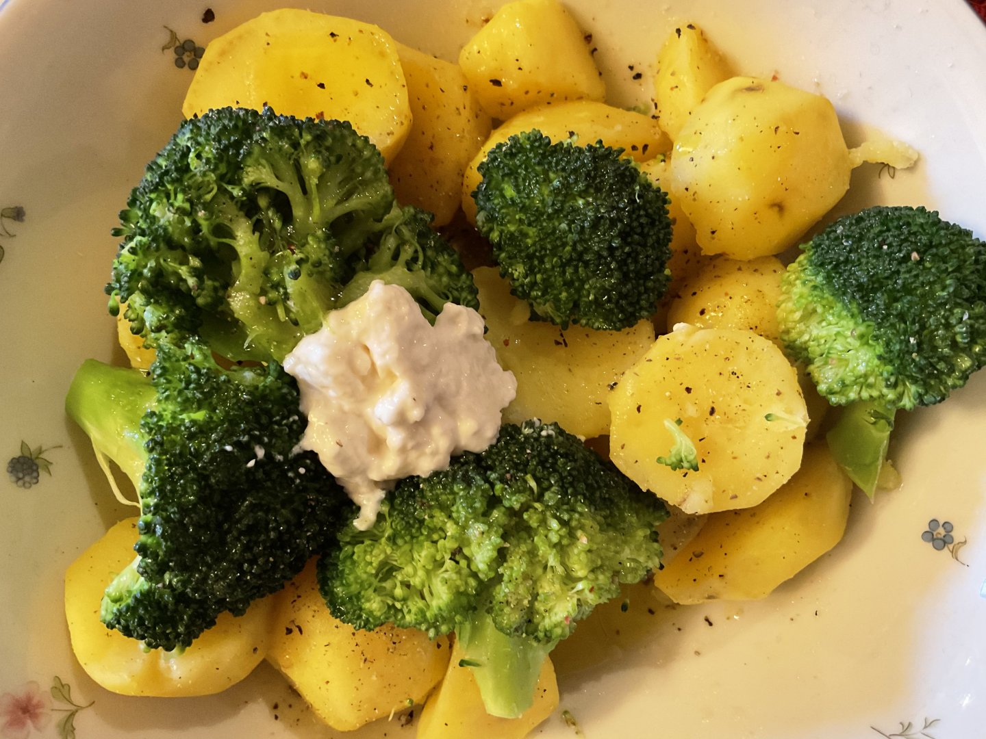 Βρασμενες πατάτες σε αλάτι.Μπρόκολο βρασμένο σε αλατισμένο νερό.