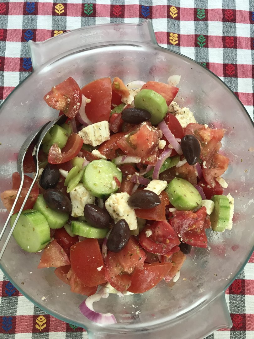 Μια κλασική χωριάτικη τούμπανο, στην οποία προσέθεσα κριθινα παξιμαδακια, κατικι αντί για φέτα και στην κορυφή 5-6 φιλετάκια γάβρο μαρινατο που είχα στο ψυγείο, γιατί ζήλεψα από τον Αρτέμιο. Αγαπημένο μπαλκονατο καλοκαιρινό γεύμα.