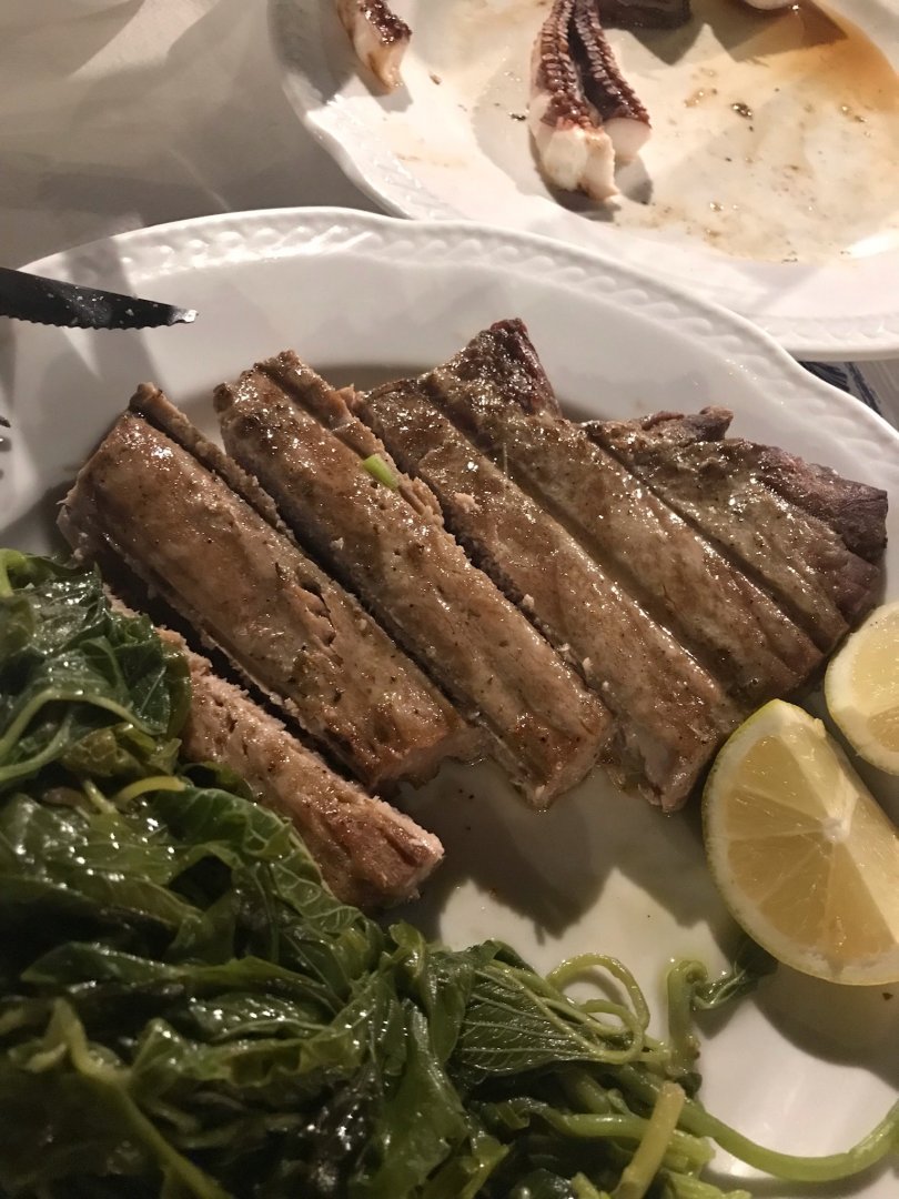 Χταπόδι λιαστό στα κάρβουνα (μετρήστε πλοκάμια παρακαλώ), χταποδοκεφτέδες, φούσκες σπινιάλο, αχινοσαλάτα, καλύμνικη σαλάτα (μερμιζέλι) και τούνα, ψημένη παραπάνω από όσο ήθελα