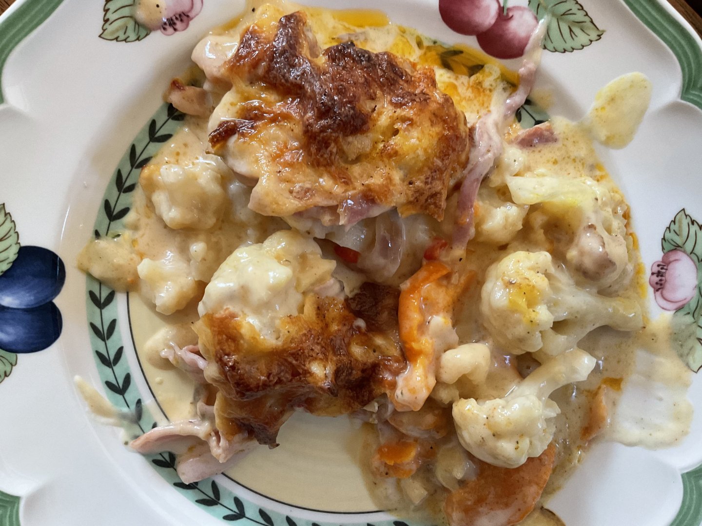 Κοτόπουλο με μανιτάρια και πιπεριές σε σάλτσα μέλι και μουστάρδας (honey mustard sauce), σε πουρέ από πατάτες φούρνου.