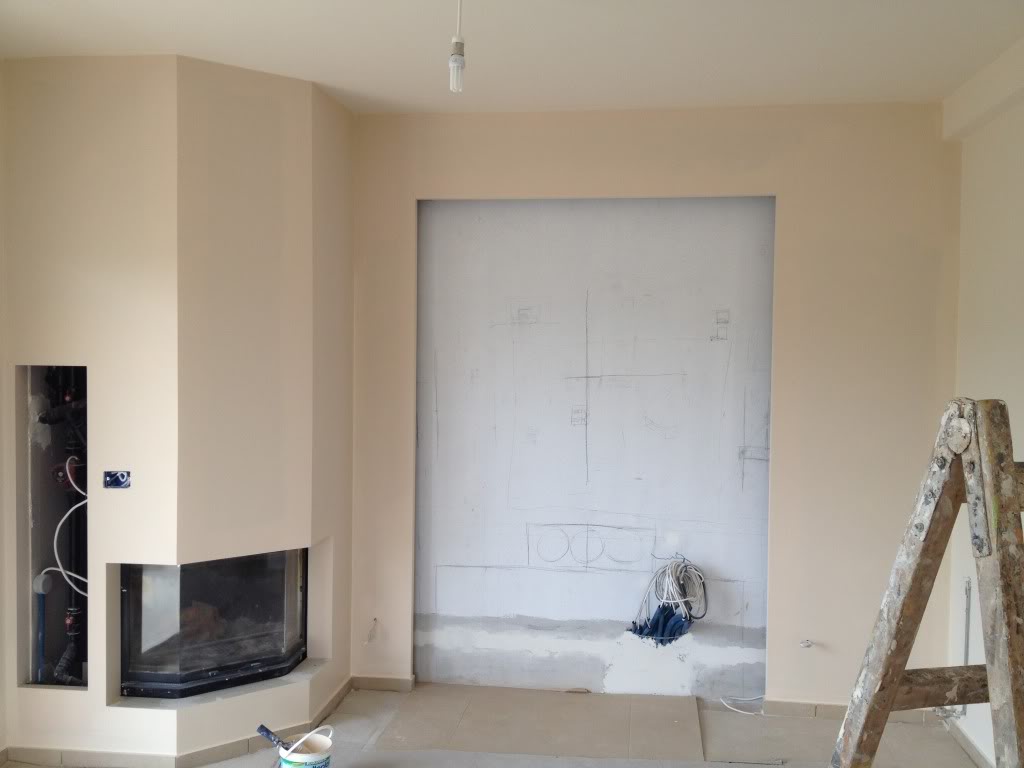 Έχουν γίνει όλες οι εγκαταστάσεις (καλωδια,δυκτιο κτλ)μέσα στον τοίχο και όπως βλέπεται έχω βάλει ένα μεγάλο κανάλι ώστε να περάσουν καλώδιο ρεύματος hdmi και ότι άλλο όπου καταλήγει κάτω χαμηλά όπου και εκεί θα υπάρχει ένα έπιπλο για μηχανήματα.