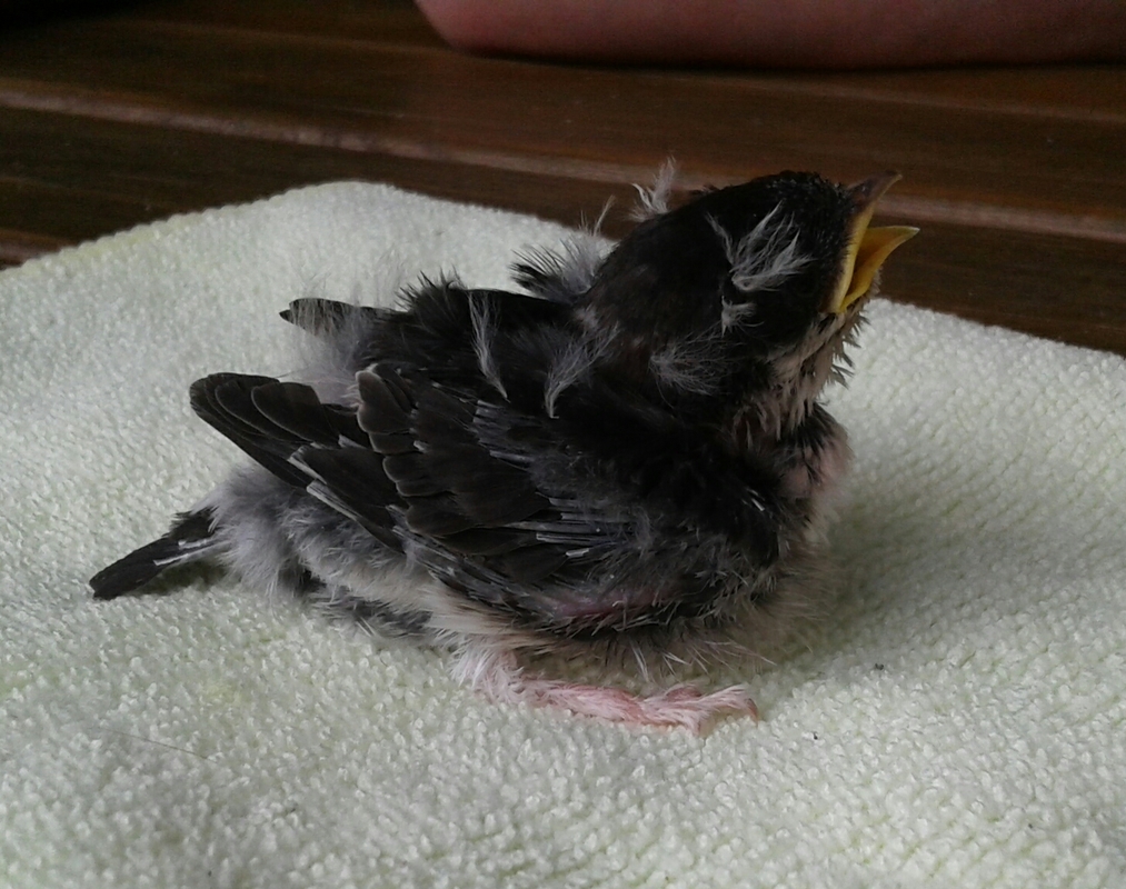 ο μικρουλης ζει στην Αγγλια και ειναι ενα ειδος χελιδονιου (ονομαζετε house martin το ειδος αυτο) , πριν 2 εβδομαδες επεσε απο την φωλια του, το συγγενικο σπιτη που τον βρηκαν τον εβαλαν σε μια προχειρη "φωλια" και απο τοτε κανει παρεα με το θυληκο Labrador που εχουν.