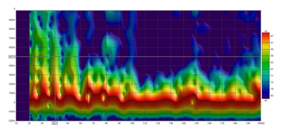 Οι τιμές RT πάνω από τα 300 Hz μπορούν εύκολα να κατέβουν το όριο των 0,5 sec με εγκατάσταση έστω και φορητών panel.Ακόμα και χωρίς τα τελευταία,η επίδραση από το πεδίο αντήχησης αναμένεται να μετριαζόταν με απλή μείωση στις διαστάσεις στερεοφωνικού τριγώνου,δηλαδή η απόσταση ακρόασης να ερχόταν σε τάξη 2 μέτρων συν ή πλην κάτι ΄΄ψιλά΄΄ σε εκατοστόμετρα...Τα καλά νέα σταματάνε κάπου εδώ,αφού από 100 Hz και κάτω γίνονται...΄΄Σόδομα και Γόμορρα΄΄.Μέσος...ξεμέσος όρος μικρή διαφορά θα είχε στη συγκεκριμένη ζώνη...