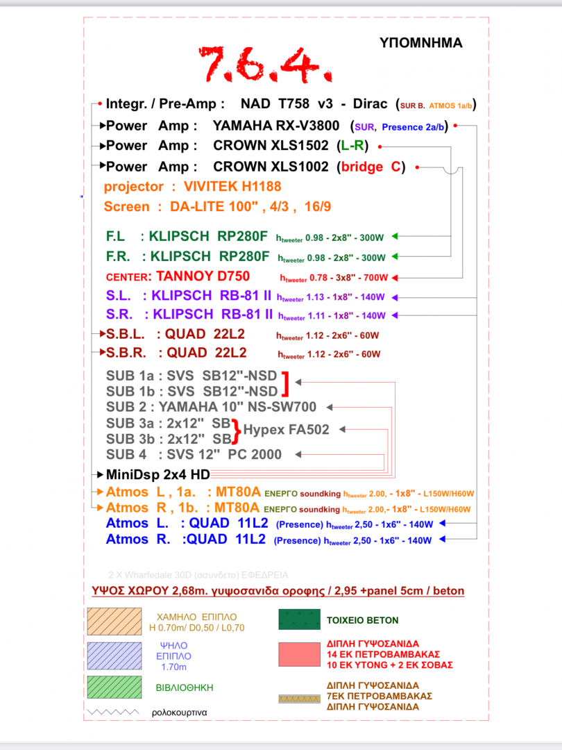 το σκεπτικό του σεταπ είναι να χρησιμοποιηθούν, ει δυνατόν, όλα τα διαθέσιμα μηχανήματα που είχα, ώστε να αξιοποιηθούν οι περισσότερες δυνατότητες του Nad, ήτοι Nad , Yamaha, minidsp = 7.6.4.
