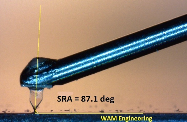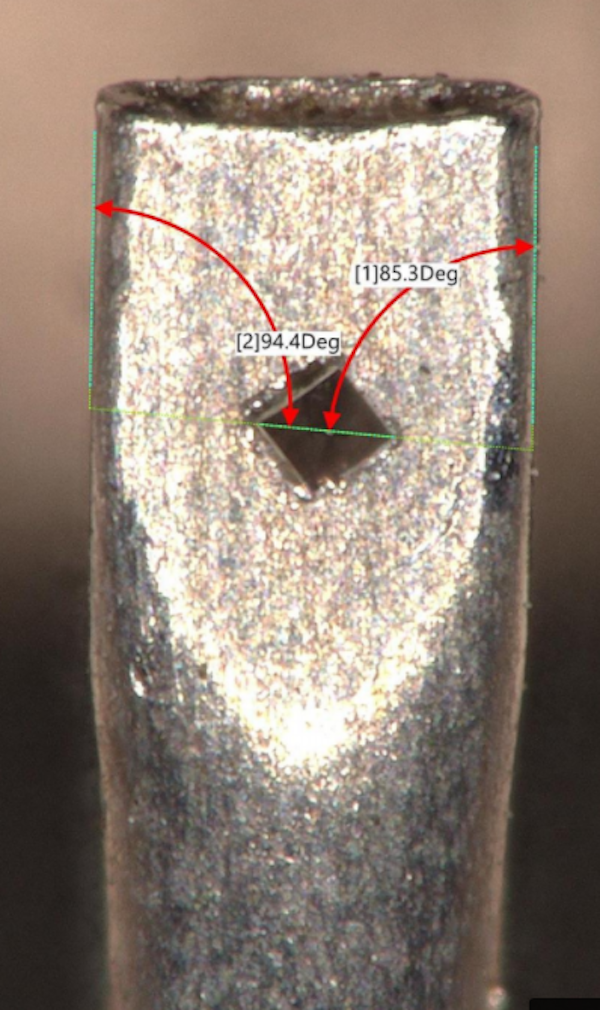 This image is the stylus of an expensive cartridge ($6000+) * with the arm set parallel to the record surface. If the buyer or installer thinks he can set SRA by "ear" by moving the back of the arm up or down, he (or she) is clearly wrong! To achieve 92 degrees here on a 9" arm, you'd have to raise the back of the arm 20 millimeters— a ski-slope of an angle! Without a microscope, the buyer or installer would simply "fiddle" with the arm, moving it up or down small amounts and never get near where the arm has to go to reach 92 degrees. Faced with this image, the best thing to do is return the cartridge and demand a properly manufactured one, especially when the cartridge costs many thousands of dollars