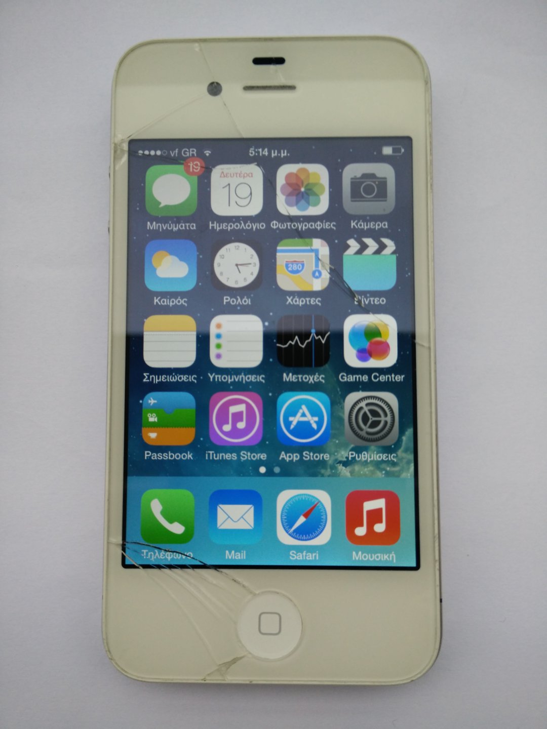 Πωλείται Apple iPhone 4 8gb με ραγισμένη οθόνη και καλώδιο φόρτισης σε άριστη λειτουργική κατάσταση.