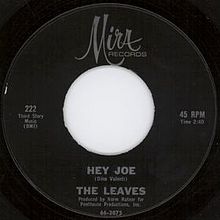 "Hey Joe" is an American popular song from the 1960s that has become a rock standard and as such has been performed in many musical styles by hundreds of different artists.[2][3] "Hey Joe" tells the story of a man who is on the run and planning to head to Mexico after shooting his unfaithful wife.[4] The song was registered for copyright in the U.S. in 1962 by Billy Roberts,[5] however, diverse credits and claims have led to confusion about the song's authorship.[4] The earliest known commercial recording of the song is the late-1965 single by the Los Angeles garage band The Leaves; the band then re-recorded the track and released it in 1966 as a follow-up single which became a hit.[6] The best-known version is The Jimi Hendrix Experience's 1966 recording, their debut single.[7] The song title is sometimes given as "Hey Joe, Where You Gonna Go?" or similar variations.