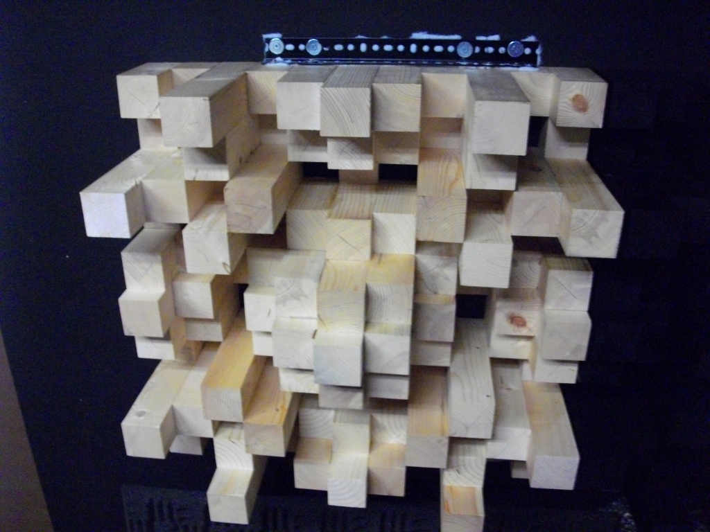 Μετα την κοπη και τον καθαρισμο των ξυλινων τεμαχιων βαση του σχεδιου τοποθετηση κολλας στις πλαϊνες επιφανειες και τοποθετηση τους ξαπλα στον παγκο ετσι ωστε να κατασκευαστει μια μια η καθε στηλη ή σειρα του διαχυτη. Για να γινει σωστα η συγκολληση τα ξυλα σταθεροποιουνται με νταβιδια πολλες φορες σε δυο αξονες (καθετα και οριζοντια) γιατι υπαρχει ο κινδυνος οπως συμπιεζονται μεταξυ τους να περιστραφουν (αυτο εξαρταται κυριως απο την ακριβεια κοπης, αν οι γωνιες ειναι 90 μοιρες). Προσοχη στην ποσοτητα της κολλας ωστε να επαρκει για να καλυψει την επιφανεια του ξυλου αλλα ταυτοχρονα να μην πεταχτει μεγαλη ποσοτητα απο αυτη.