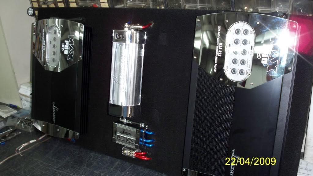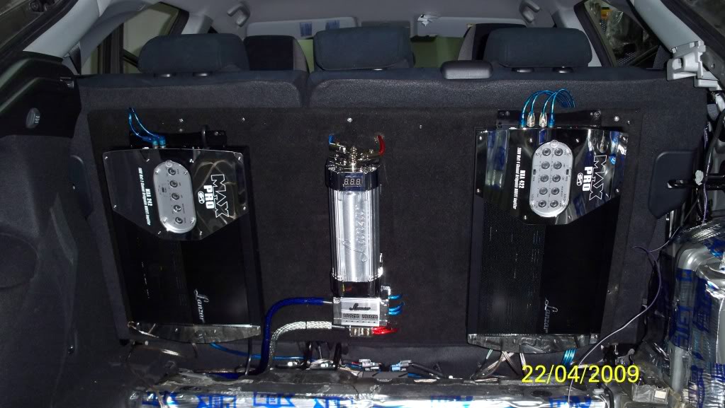 Along with the capacitor,the fuse block and a grounding unit, were mounted on a wooden board 1m x 0.5m and then mounted on the back of the rear seats....