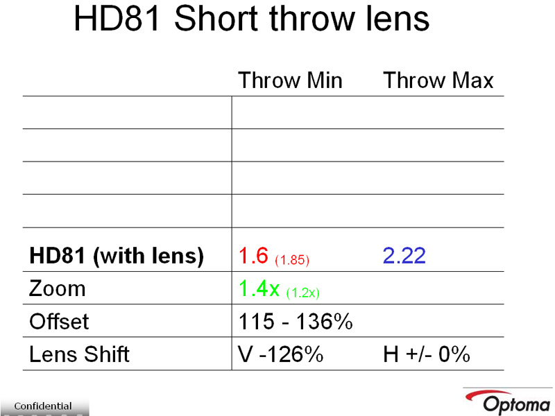 <table cellpadding=10 cellspacing=0 border=1><tr><td></td><td>HD81<br> optoma-hd81.jpg </td><td>HD81 LV<br> Optoma-HD81-LV.jpg </td></tr><tr><td>Πάνελ</td><td>1xDLP 1080x1920 0.95" DC3</td><td>1xDLP 1080x1920</td></tr><tr><td>Brightness</td><td>1400 lumens</td><td>2500 lumens</td></tr><tr><td>Contrast</td><td>10000:1</td><td>10000:1</td></tr><tr><td>Color wheel</td><td>7 segment x 4 speed (?)</td><td>5 segment (RGBYW) x 3 speed</td></tr><tr><td>Throw Ratio</td><td>1.85-2.22:1 (distance/width)</td><td>1.85-2.22:1 (distance/width)</td></tr><tr><td>I/O</td><td>scaler</td><td>2 x HDMI (v1.3), 1 x DVI,<br>Component, S-video, Composite</td></tr><tr><td>Βάρος</td><td>4.5 + 4.2 Kgr</td><td>5 Kgr</td></tr></table>